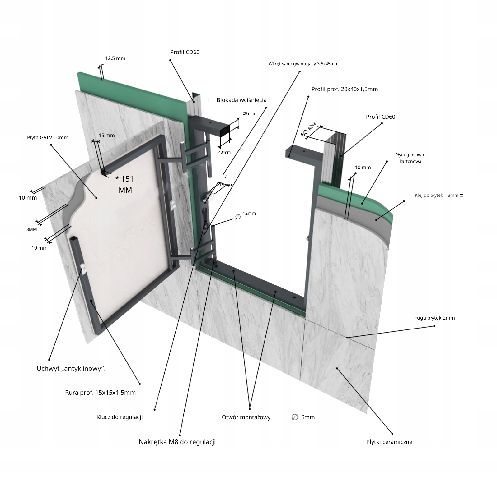 Наши люки аудита характеризуются исключительным качеством и точностью. Два петли позволяют минимальные зазоры между плитками. Специальный механизм для открытия дверей наклона предотвращает осколки на краях соседних плиток, что особенно важно для миллиметровых пробелов. Петли изготовлены из покрытой стали, окрашенной антикоррозивной краской, что гарантирует их долговечность и сопротивление интенсивному использованию.