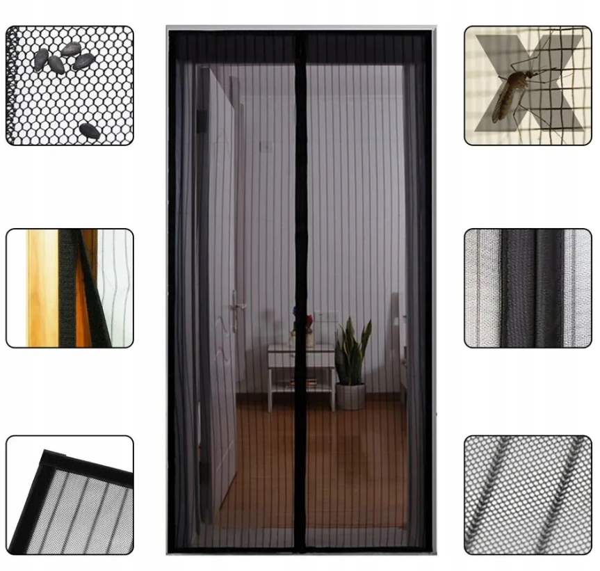 Москитная сетка легко закрывается с помощью магнитов. Отличная плотность и прочность сетки. Прочные швы и дополнительно усиленные лямки. Его размер подходит для стандартных дверей и польских домов.
