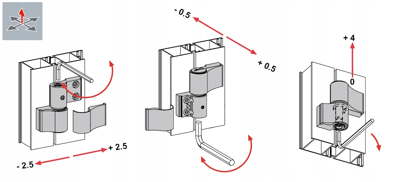 Петли для алюминиевых дверей, расстояние между крепежными винтами 67 мм. Белый цвет. Loira+ имеет три варианта регулировки: горизонтальную, вертикальную и давление уплотнения; каждая регулировка независима от других и может выполняться оператором только тогда, когда дверь находится в закрытом положении.