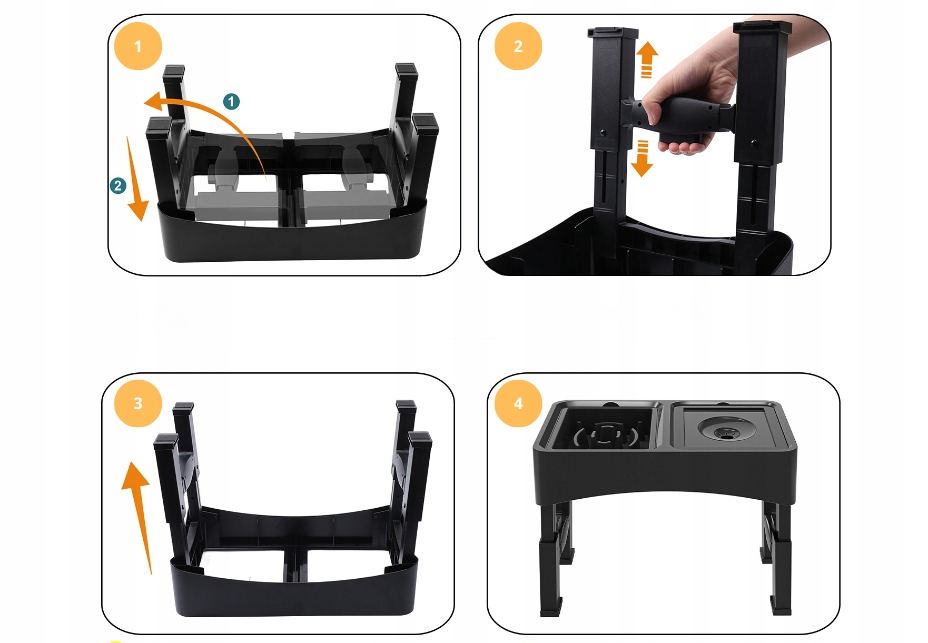 Подъемная подставка для корма и воды для собак с четырьмя регулируемыми высотами может быть легко собрана без инструментов. Подставку также просто собирать и разбирать, что позволяет аккуратно хранить ее, когда она не используется. Складные ножки облегчают хранение и транспортировку.