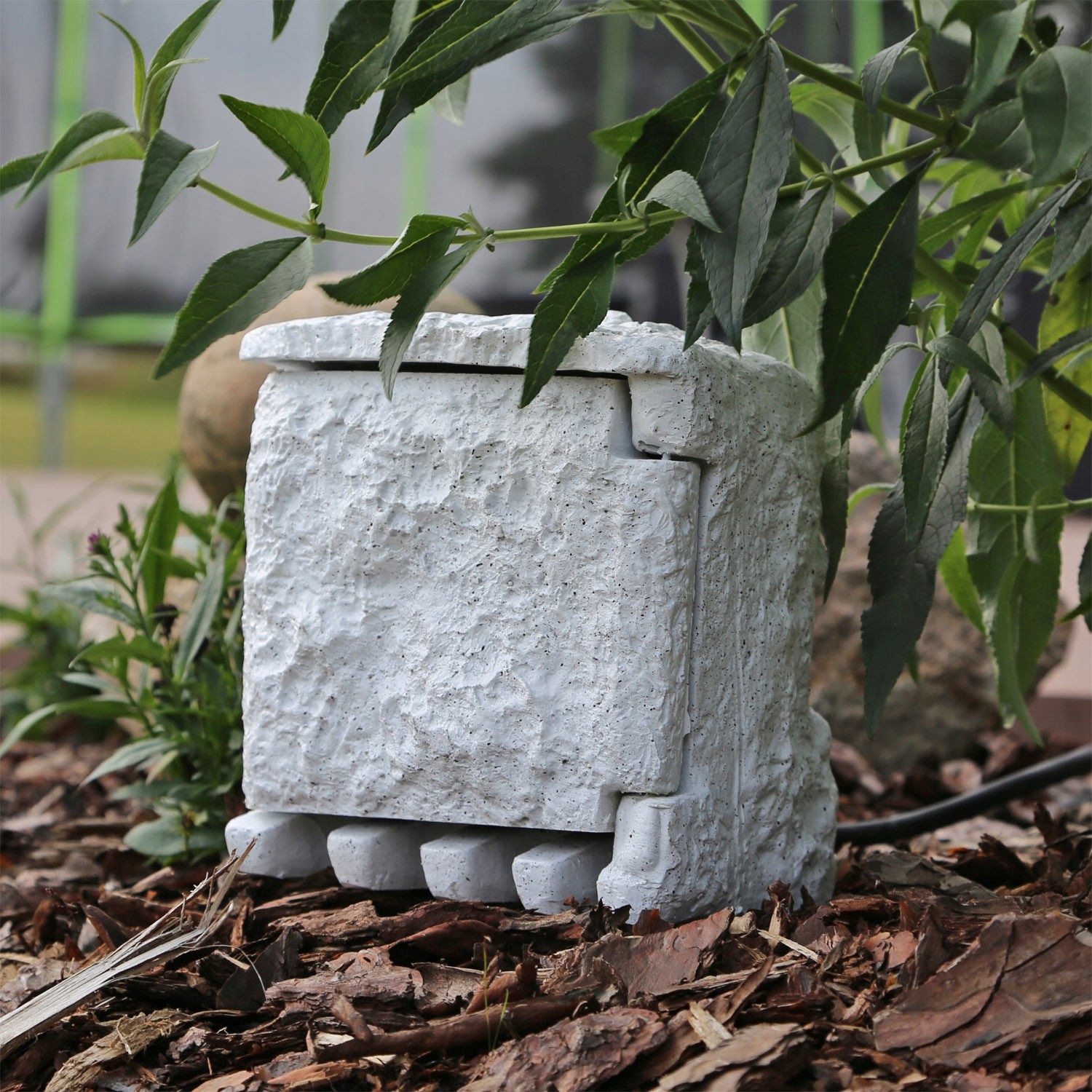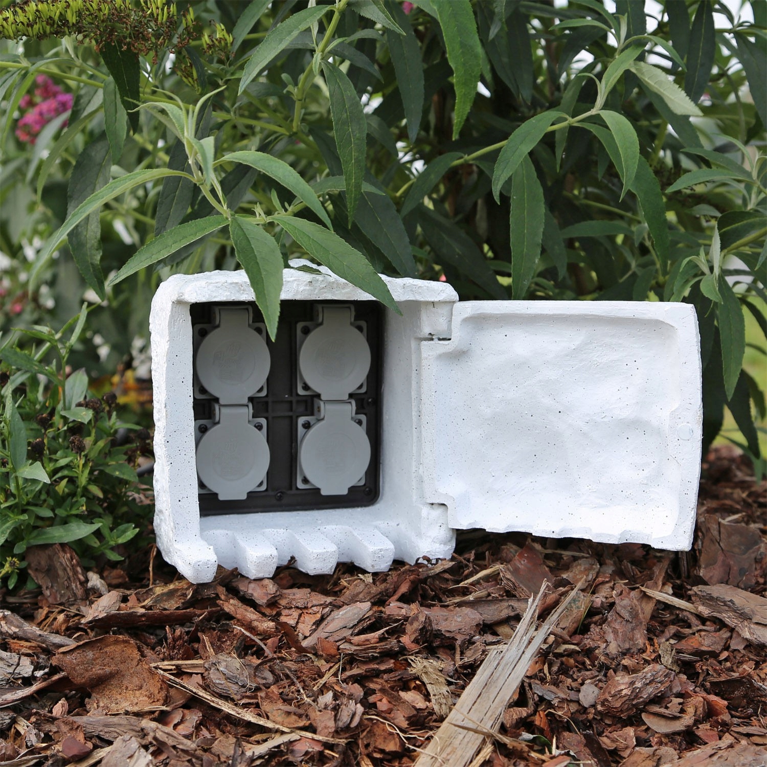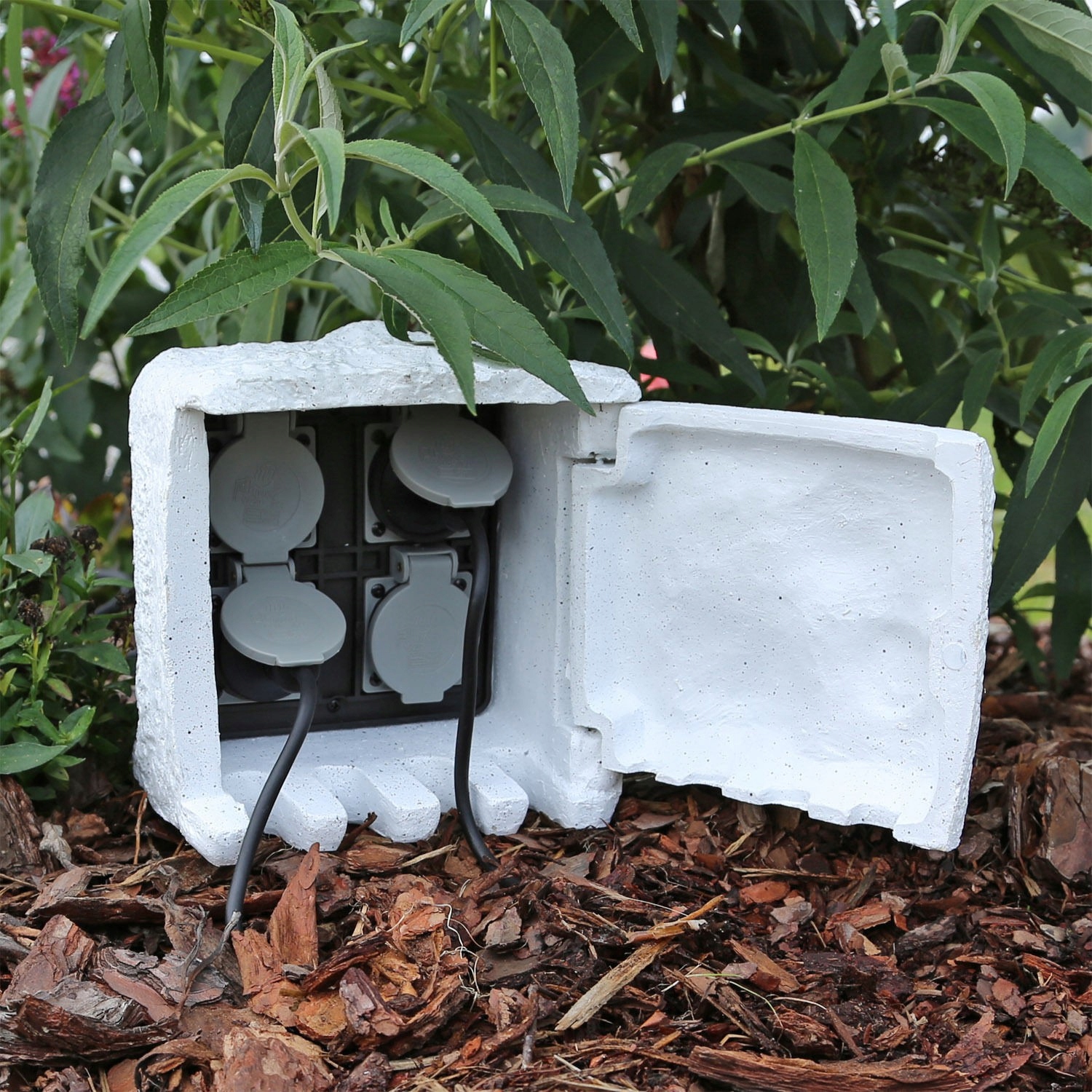 В основании сплиттера имеются специальные розетки для кабелей подключаемых устройств. Такое решение позволяет полностью скрыть электроустановки, благодаря чему объект становится совершенно незаметным и даже украшает природный сад