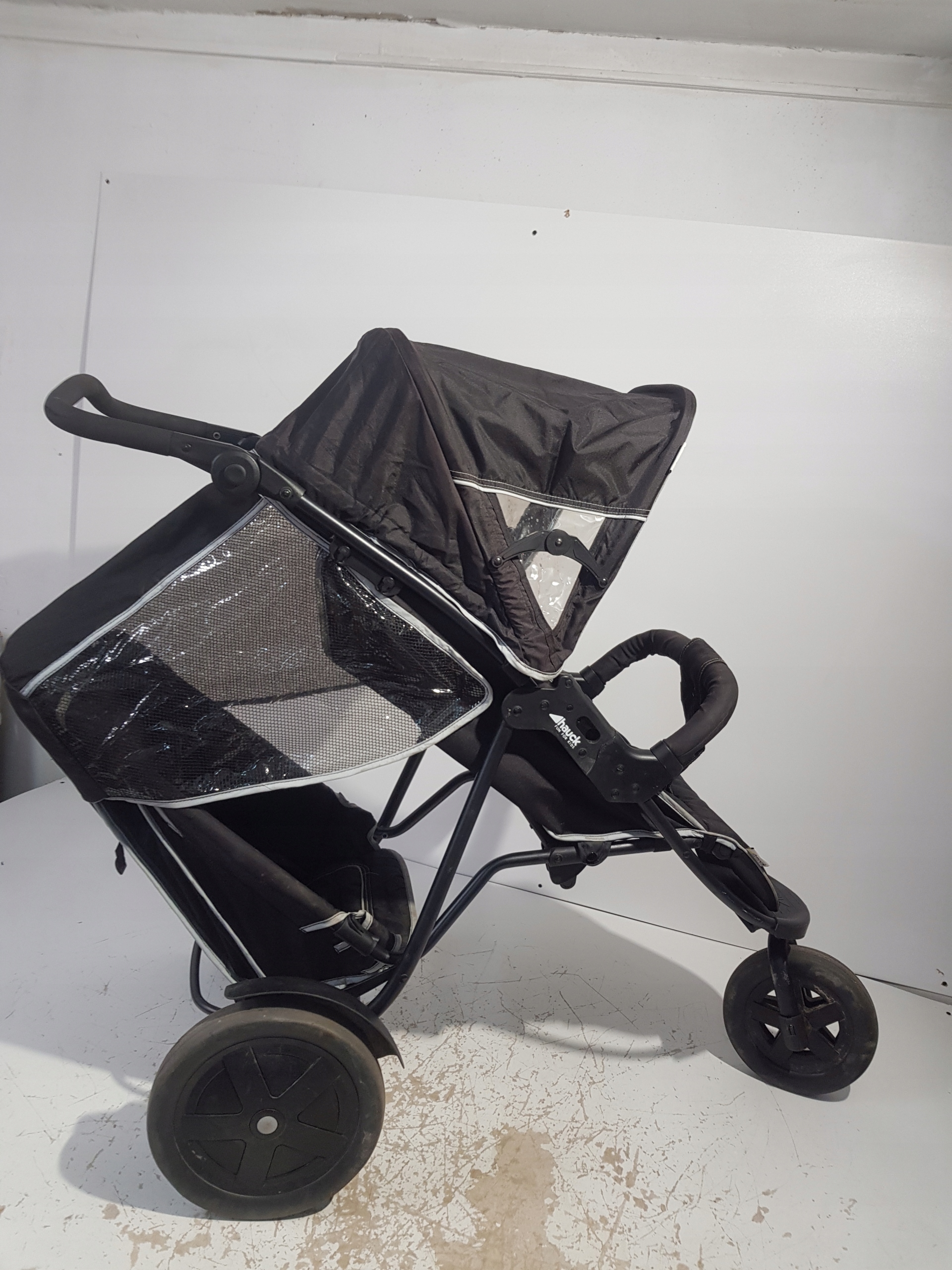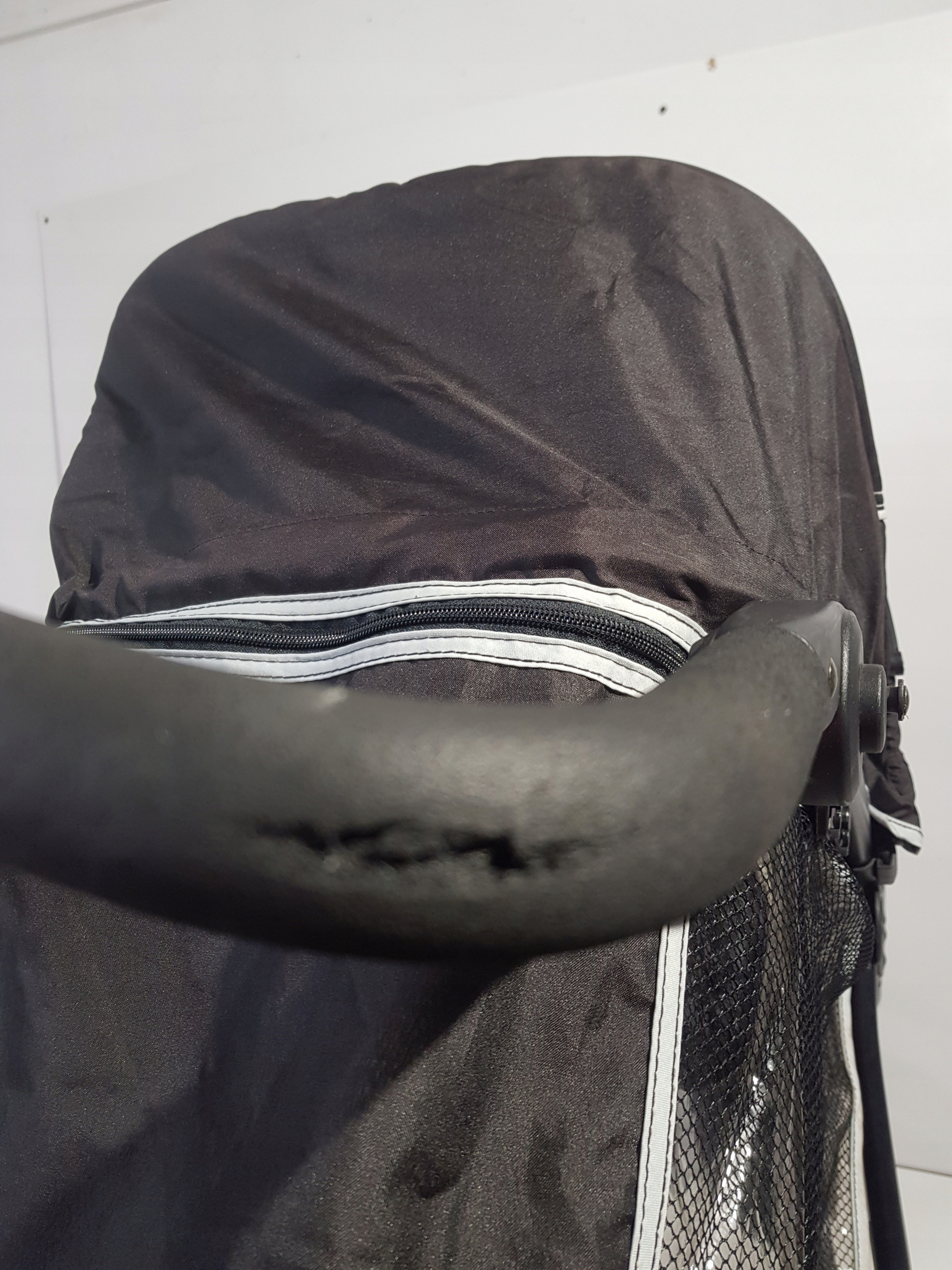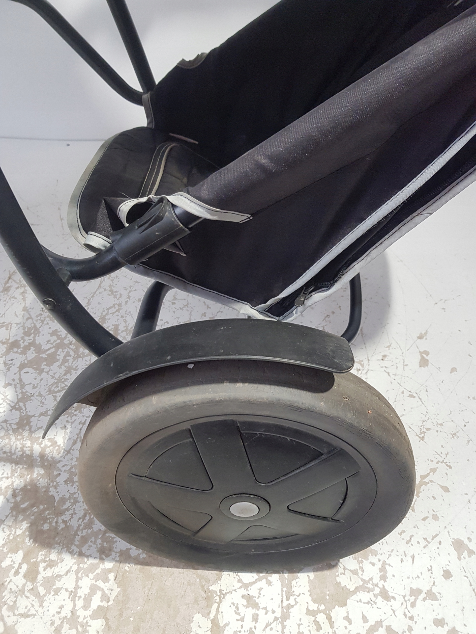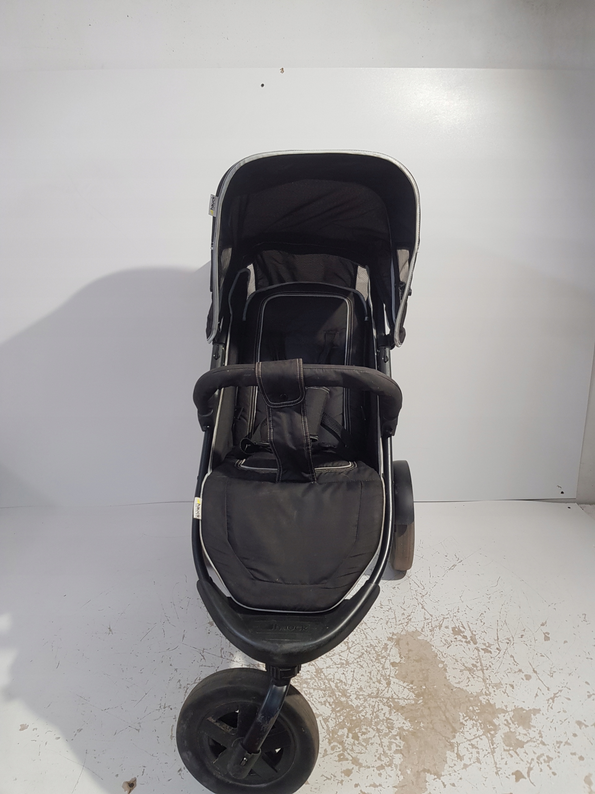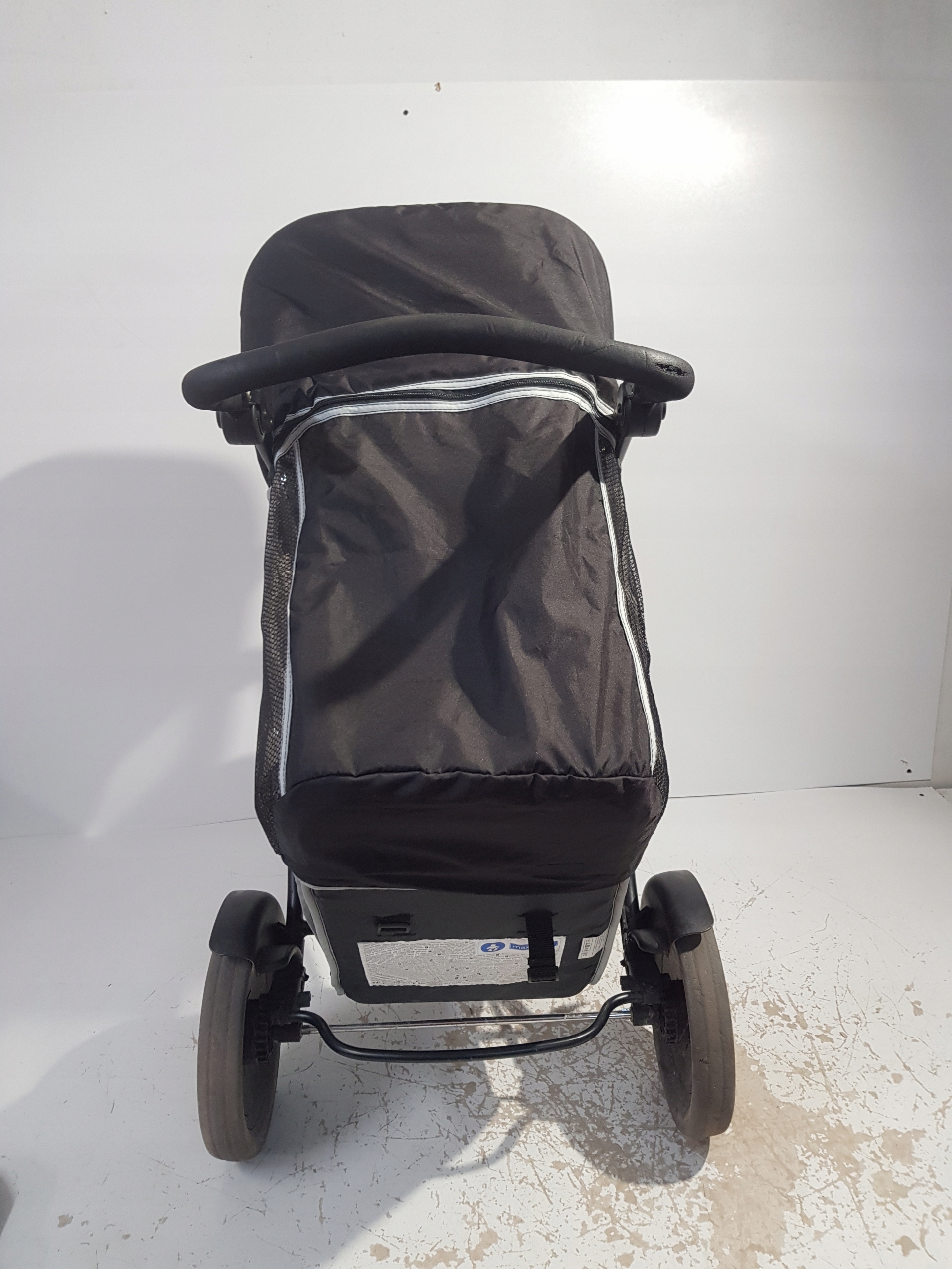 У нее три больших колеса, благодаря которым коляска передвигается легко и маневренно. Переднее колесо может вращаться на 360 градусов и блокироваться. Ручка регулируется по высоте, коляска имеет большую корзину для покупок, регулируемую подножку и спинку. Спинка заднего сиденья может быть отрегулирована в положение покоя.