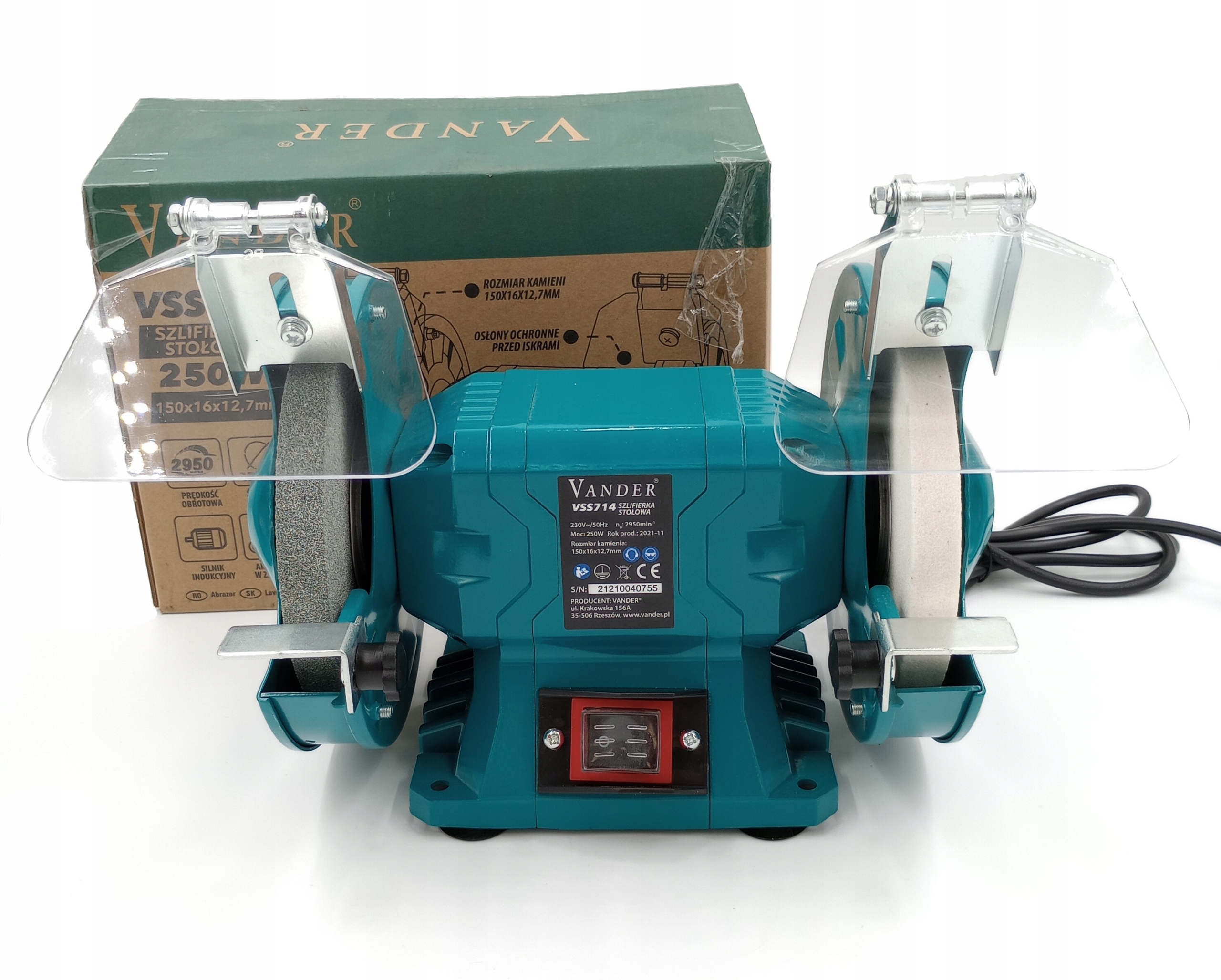 Настольный шлифовальный станок с 2 камнями VSS714 польского бренда Vander – это базовое оборудование для домашней мастерской, гаража или сервисного центра. Прибор полностью изготовлен из металла, включая корпус и крышки точильного камня, что делает его пригодным для работы в тяжелых условиях и устойчивым к механическим повреждениям и износу. Сердцем устройства является прочный асинхронный электродвигатель мощностью 250 Вт, который позволяет работать с различными видами материалов даже под большой нагрузкой и в течение длительного времени. Асинхронный двигатель гораздо менее неисправен, чем щеточные двигатели, и гарантирует более длительный срок работы без необходимости замены компонентов. Благодаря правильно отрегулированной мощности двигателя устройство не создает чрезмерных вибраций и шума – бесшумная и эффективная работа являются крайне важными преимуществами такого оборудования. Чтобы адаптировать болгарку к работе в сложных условиях с повышенной запыленностью, производитель оснастил ее герметичным выключателем, устойчивым к загрязнениям и пыли, что значительно повышает не только безопасность использования, но и устойчивость к сбоям. Точному шлифованию, очистке или заточке, несомненно, способствуют высокие обороты двигателя, достигающие 2950 об/мин. В заводской комплектации устройства установлены два камня разной зернистости – крупнозернистый и корундовый. Дополнительным преимуществом измельчителя является использование регулируемых пластиковых крышек, защищающих оператора от искр и возможных попаданий камней или обрабатываемого материала, а также регулируемых насадок. Шлифмашина имеет ножки, стабилизирующие устройство, и диски с опорами для заготовок.