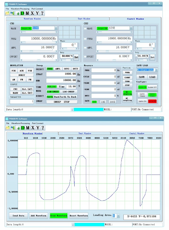 Программное обеспечение, управляющее работой Функциональные генераторы серии FY6800 FeelTech работают в системах Windows, что позволяет вам иметь практически полный контроль над устройством. Программное обеспечение очень простое в использовании. Связь между компьютером и генератором осуществляется через USB-порт.