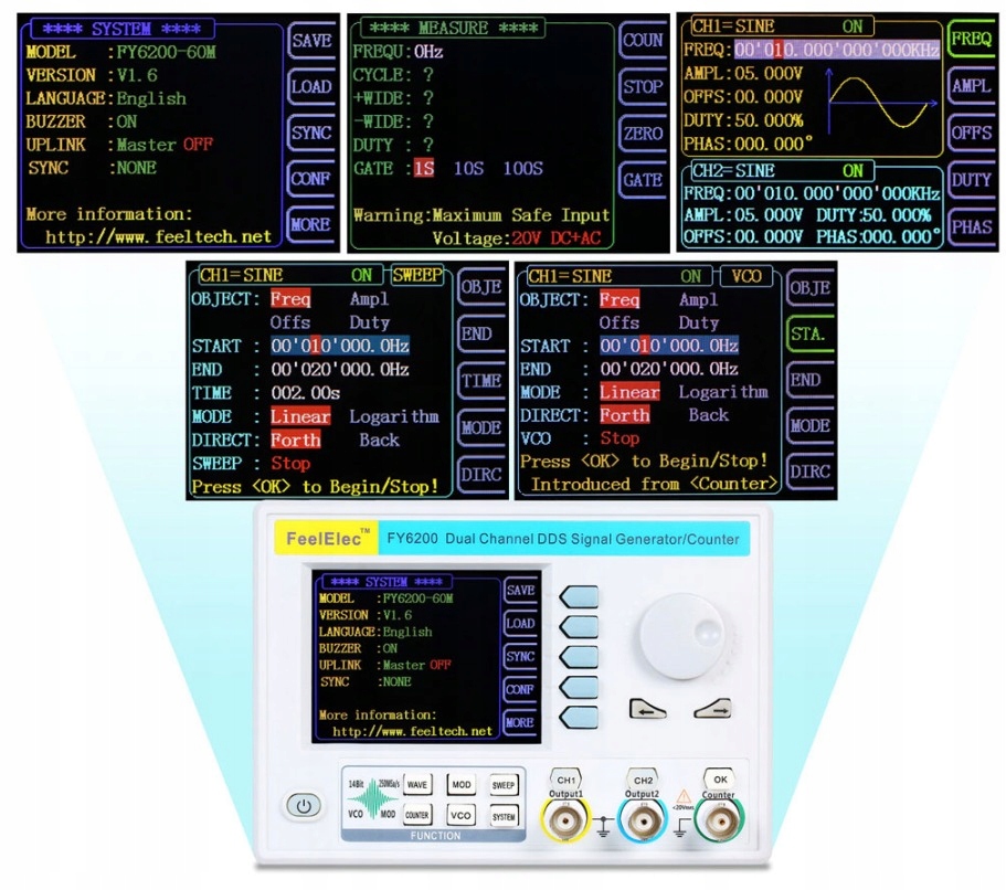 Генератор FY6200 FeelTech будет перемещаться между двумя заданными значениями частоты fd и fg в заданное пользователем время линейным или логарифмическим образом. Генераторы серии FY6200 дополнительно имеют встроенный счетчик и частотомер на 100 МГц. Встроенный USB-интерфейс в генераторе функций и программное обеспечение ПК для системы WIN позволяют контролировать ее работу, только повышая комфорт работы.