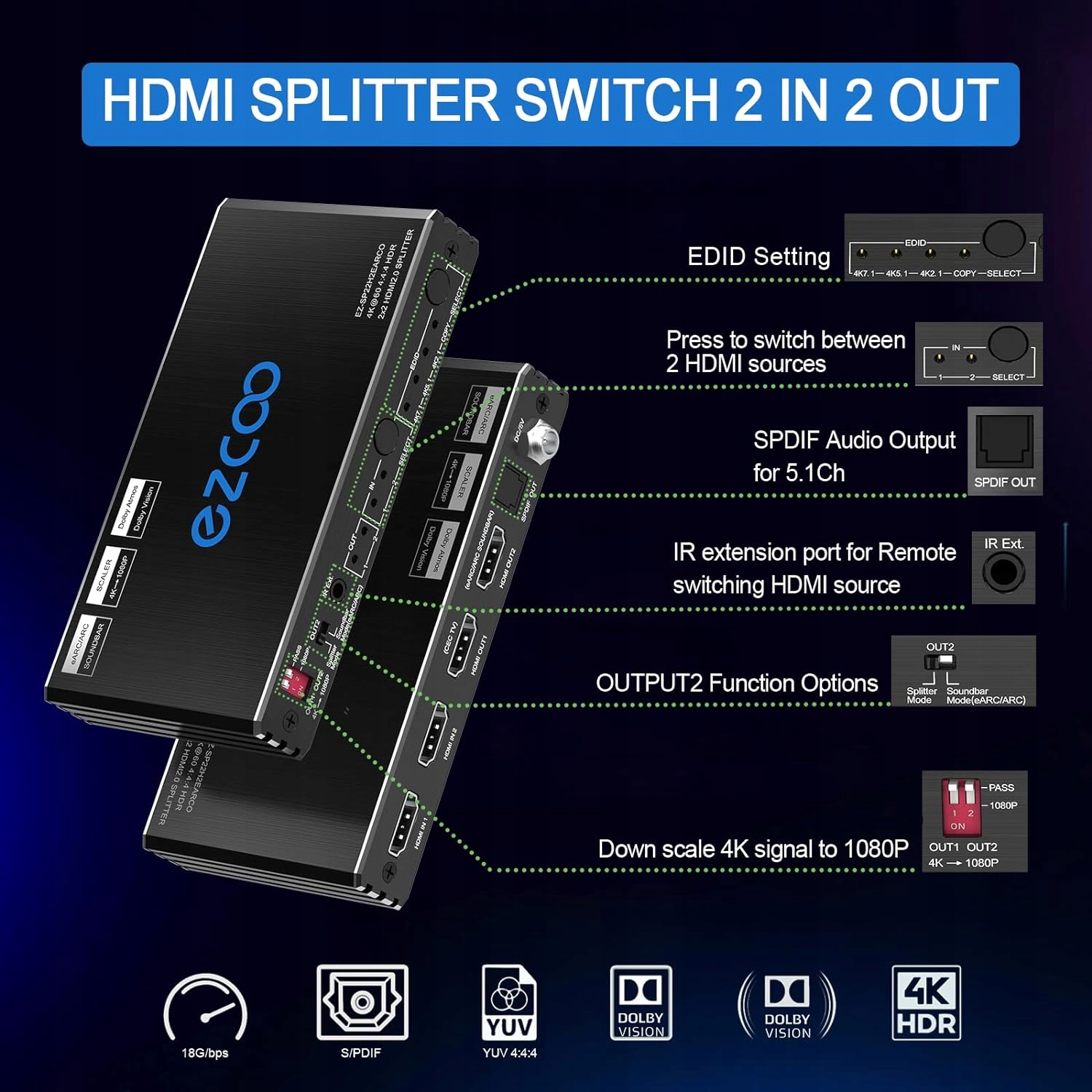 2-полосный разветвитель HDMI 4K, 60 Гц — разветвитель HDMI 6,5 см² Выход HDMI или переключатель 2 входа на 2 выхода для HDMI с поддержкой Ultra HD 4K . Этот разветвитель надежно переключает два сигнала источника HDMI на два выхода HDMI. Особенно если у вас есть телевизор, который не поддерживает eARC, вы можете использовать этот разветвитель для эмуляции порта eARC и передачи высококачественного звука Atmos на звуковую панель. один телевизор 4K и один телевизор 1080P поддерживают выход 4K и 1080P одновременно. CEC включен HDMI OUT 1