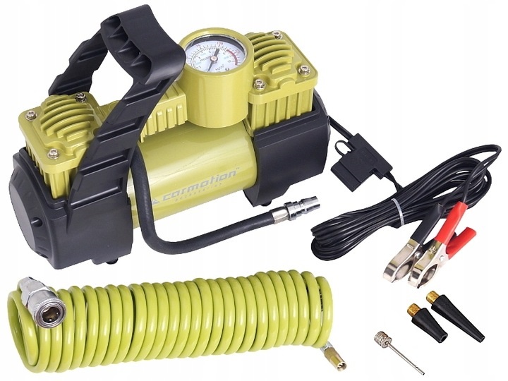 Прочный, металлический, двухпоршневой компрессор с манометром. Компрессор предназначен для накачивания колес, мячей, понтонов, бассейнов и т. д. благодаря трем различным насадкам-клапанам, входящим в комплект. Он может справиться с большими колесами автомобилей 4x4 - внедорожник - фургон - грузовик - кемпинг.