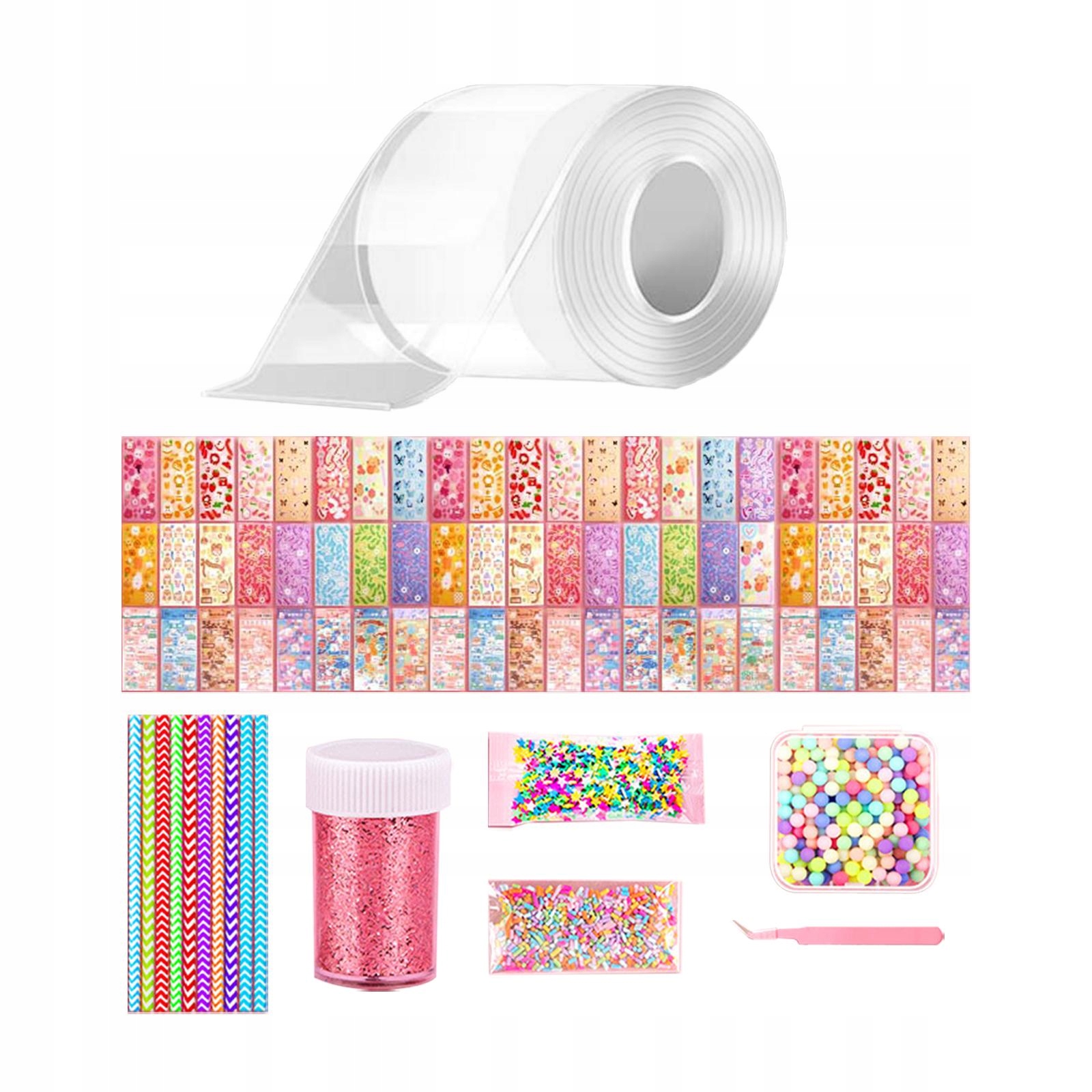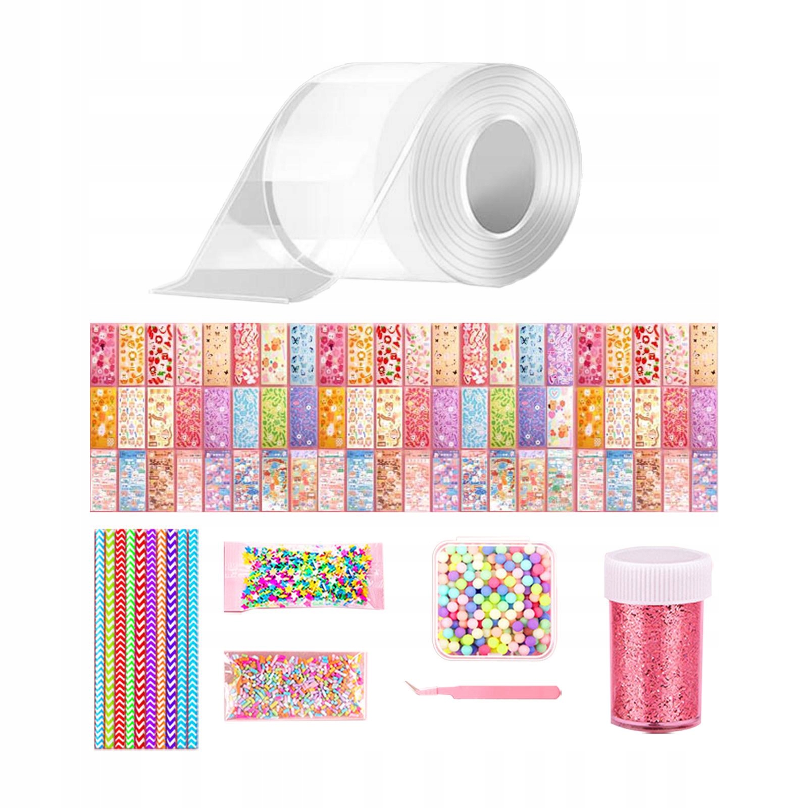 2 рулона скотча, 10 наклеек, 10 воздуходувок, 1 упаковка блесток, 1 упаковка пятиконечной звезды, 1 упаковка сахарных гранул, 1 упаковка бусинок, 1 пинцет