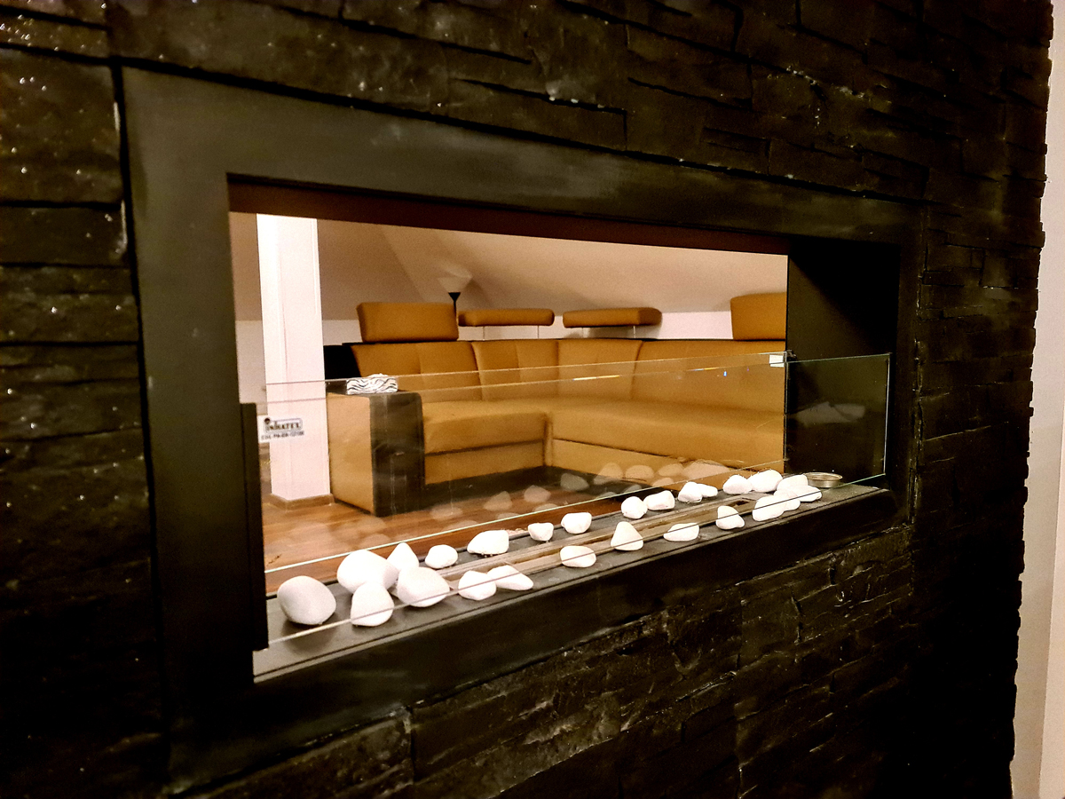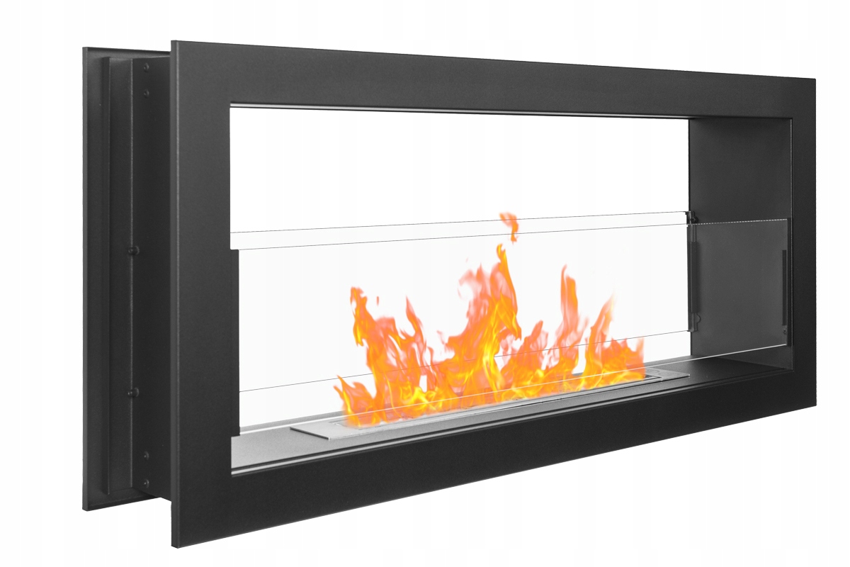 Проходной биокамин польского производства. Двусторонняя модель с двойным видением огня представляет собой готовую вставку для установки в стену или подготовленное отверстие или для установки во встроенную конструкцию (также из гипсокартона).