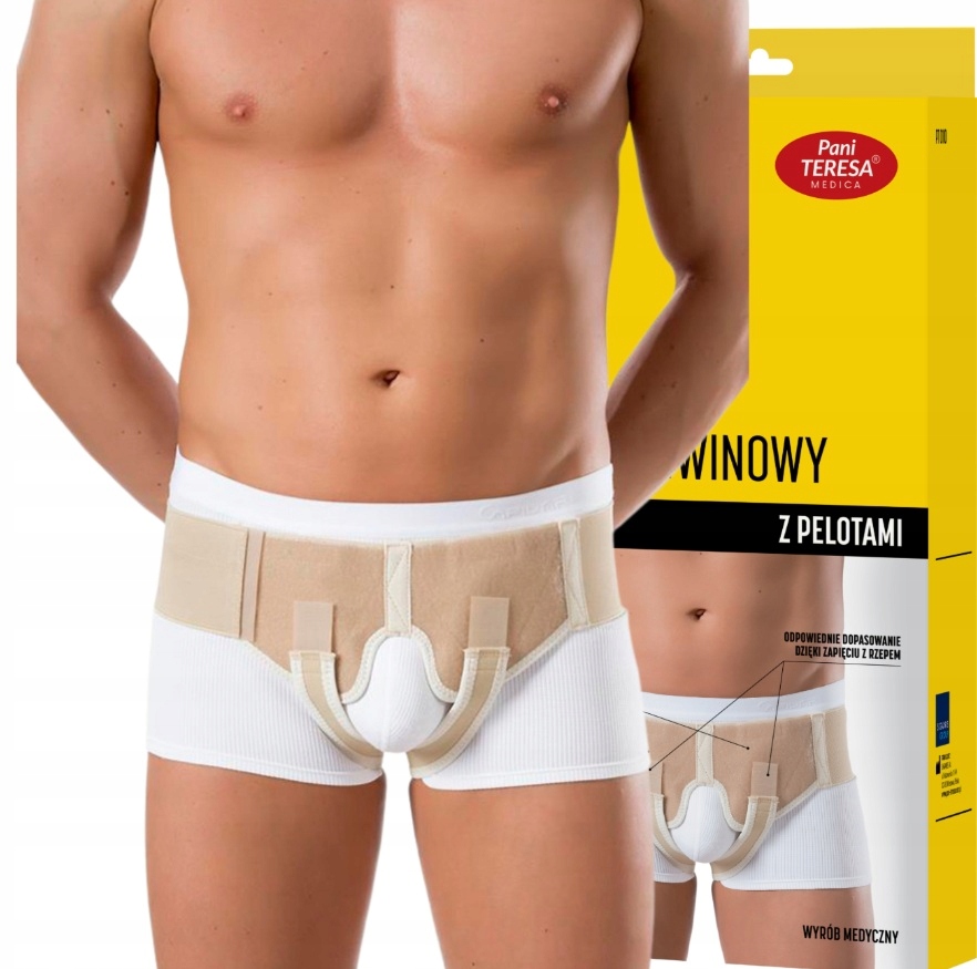 Двусторонний паховый пояс с пелотами польского бренда Mrs. Teresa используется у пациентов (как у женщин, так и у мужчин) с простой или наклонной паховой грыжей. Он также используется после операции в случае слабых и холодных скелетно -скелетных аппаратов, не позволяя душе выходить за пределы кольца пахового канала.