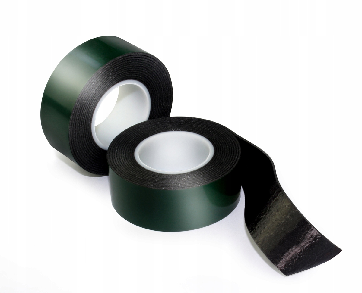 Черная двусторонняя клейкая лента на основе вспененного полиэтилена с акриловым клеем на основе растворителя. Клей защищен зеленой фольгой.