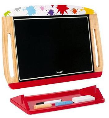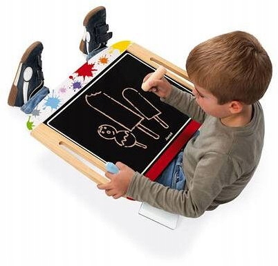 Оно наверняка понравится малышам и школьникам. Компактные размеры позволяют легко использовать его в случае болезни и когда вам нужно удержать ребенка в постели. Это сделает его время более приятным, доставив ему творческое удовольствие. С одной стороны на ней можно писать мелом, а с другой - сухостираемым маркером. Кроме того, в комплект доски входит блокнот, который облегчит хранение аксессуаров. Состав: 2 мела, стираемый маркер и губка. Он изготовлен из дерева и окрашен безопасными красками. Он также идеально подходит для путешествий на машине.