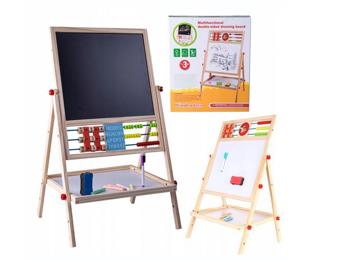 Доска работает отлично. Приятная вещь — винты, которые блокируют вращение доски, поэтому ребенок может установить поле для рисования под нужным углом. Дополнительным преимуществом являются учебные пособия: счеты, цифры, часы и даже алфавит.