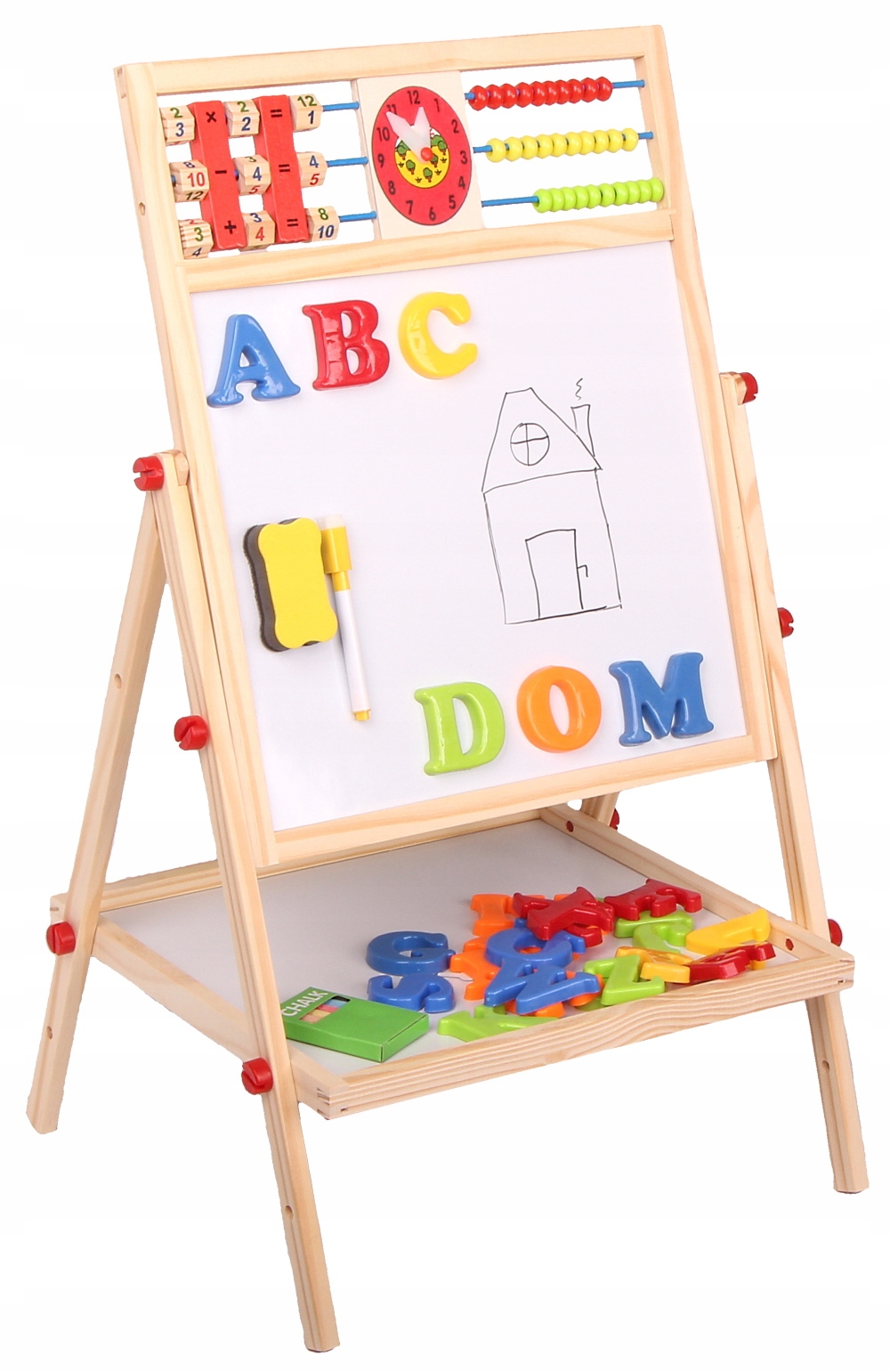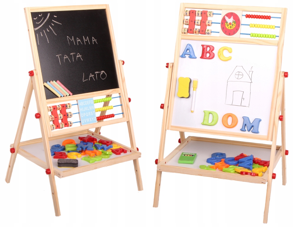 1 ДОСКА = 6 ФУНКЦИЙ. двусторонняя доска имеет до 6 различных применений. Это позволяет ребенку рисовать мелом на черной стороне доски и рисовать маркером на белой стороне. На доске также есть классические счеты с бусинами, с помощью которых ваш ребенок начнет свое приключение со счетом. Затем они смогут освоить основные математические операции, такие как сложение, вычитание и умножение. У ребенка также будут часы, на которых он сможет свободно устанавливать время с помощью стрелок; научитесь узнавать время. Также на доске имеется алфавит и набор магнитов - прикрепленных букв, что позволит ребенку познакомиться с первыми буквами, что в дальнейшем позволит ему составить свои первые слова.