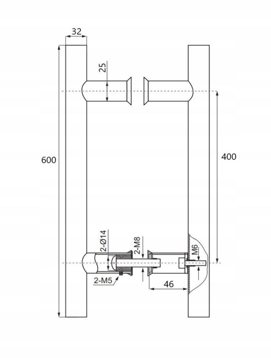 Высококачественный двусторонний зажим из матовой нержавеющей стали профилем 32мм и общей длиной 600мм предназначен для установки на двери толщиной 8-12мм. >