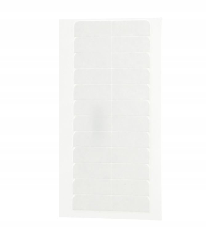 Ленты изготовлены из прочнейшего клея и препаратов, сохраняющих высокую эластичность. Гипоаллергенный продукт. Ленты продаются в листах по 12 лент размером 4х0,8 см. Ленты двусторонние.