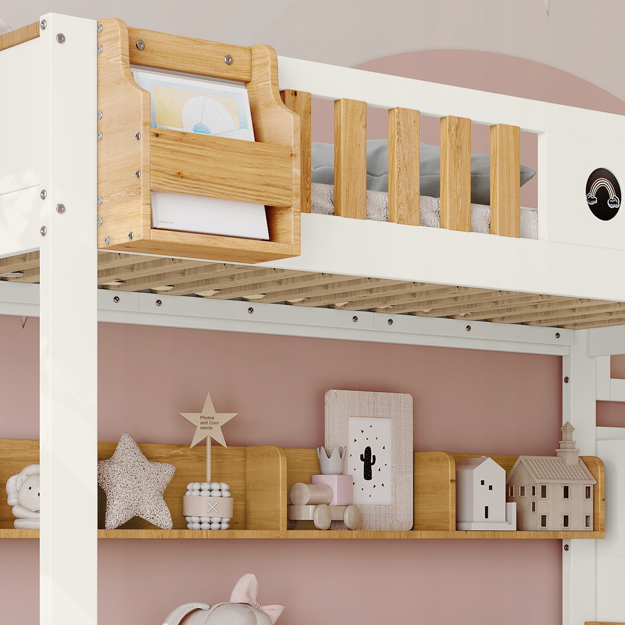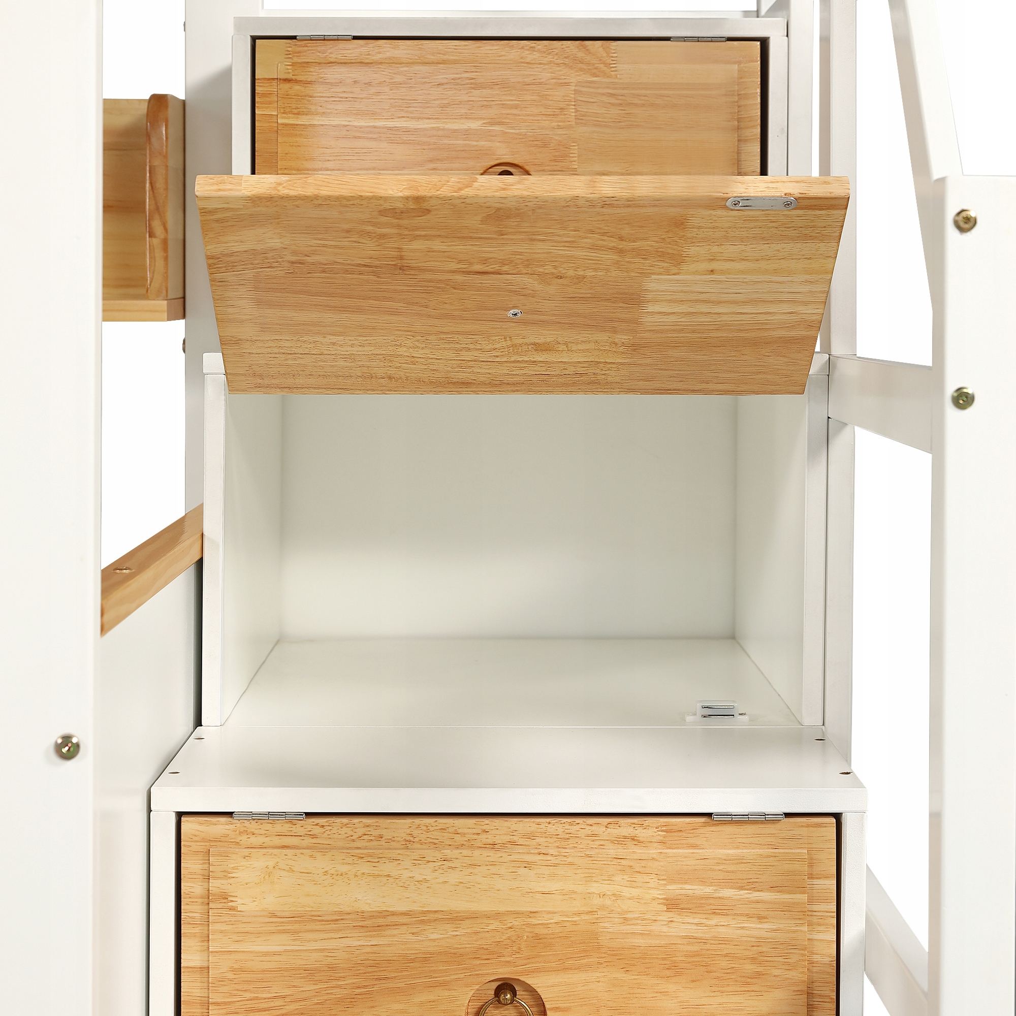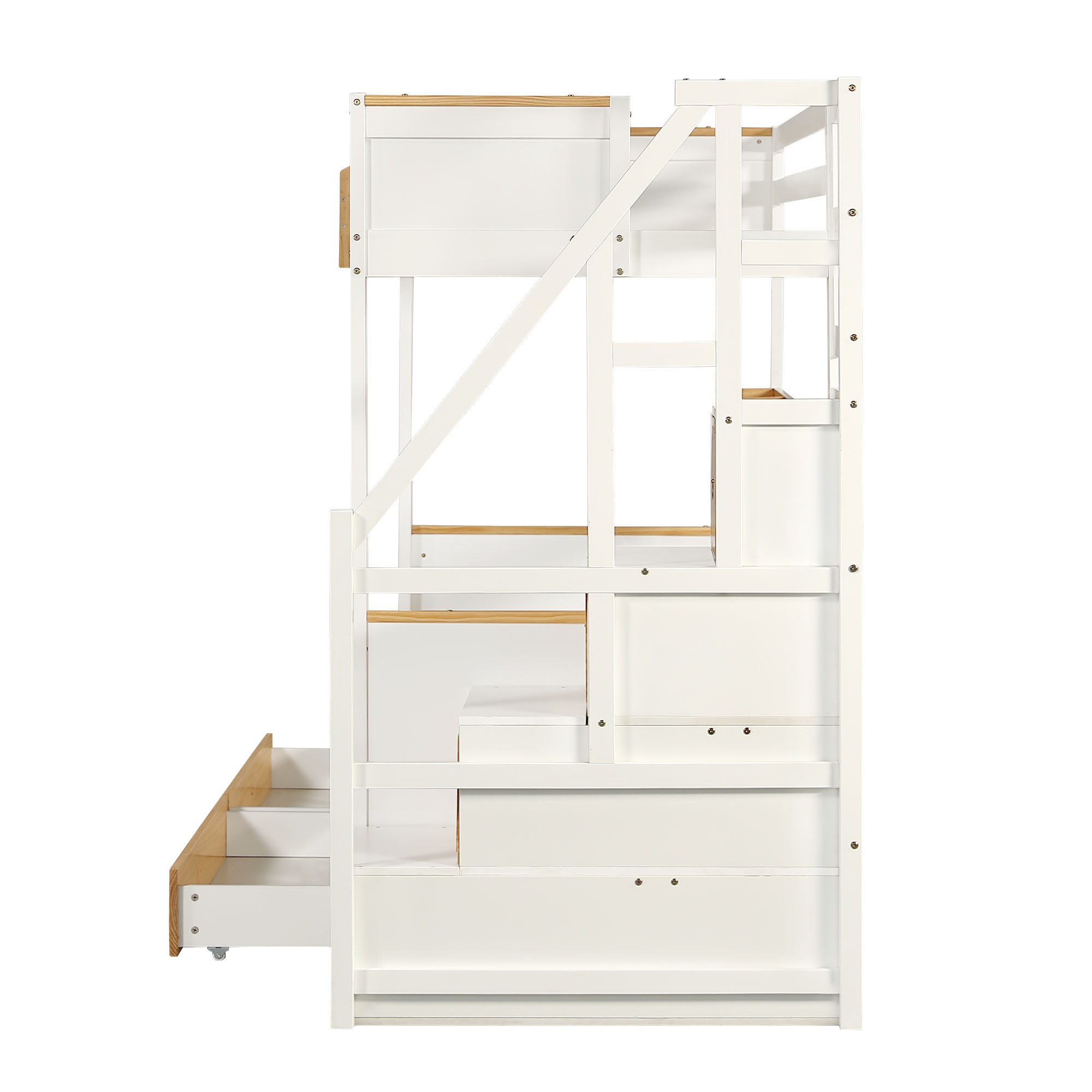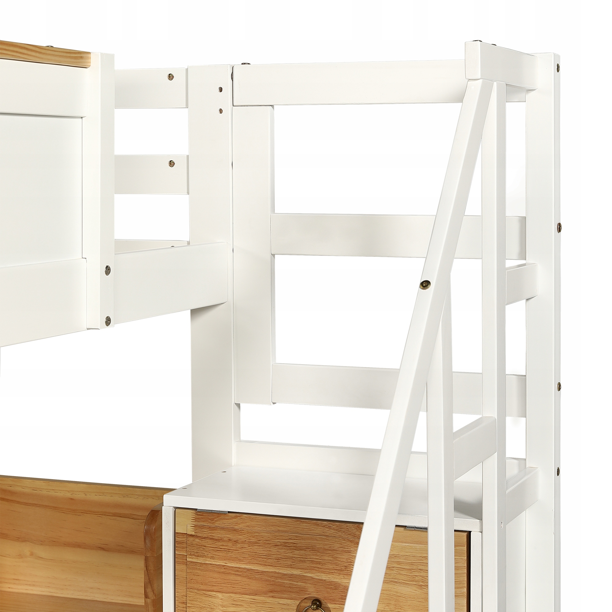 двухъярусная кровать с лестницей, большим количеством места для хранения, сосновой древесиной и рамой MDF, детской кроватью с 4 шкафами на лестнице, с защитником, защищающим от падения и 2 ящика, открытая полка, белая + натуральная, 90x200 см