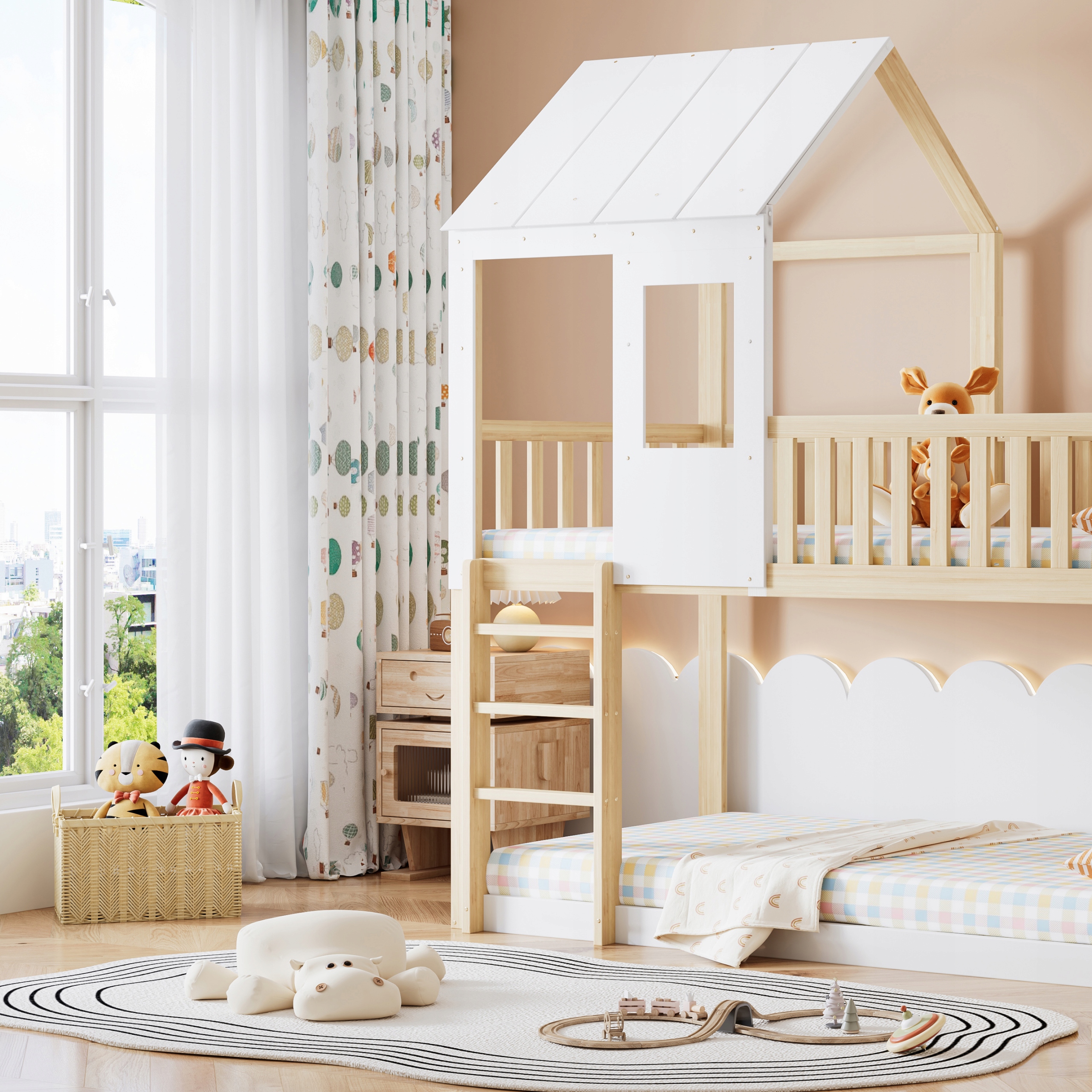 ✨【 Стильная крыша и окна】 Белая крыша и окна на первом этаже создают атмосферу небольшого чердака, предоставляя детям безопасное и погодное стойкое место для сна. Вы можете отрегулировать крышу и окна в свои предпочтения, чтобы получить более стильную и уникальную кровать.