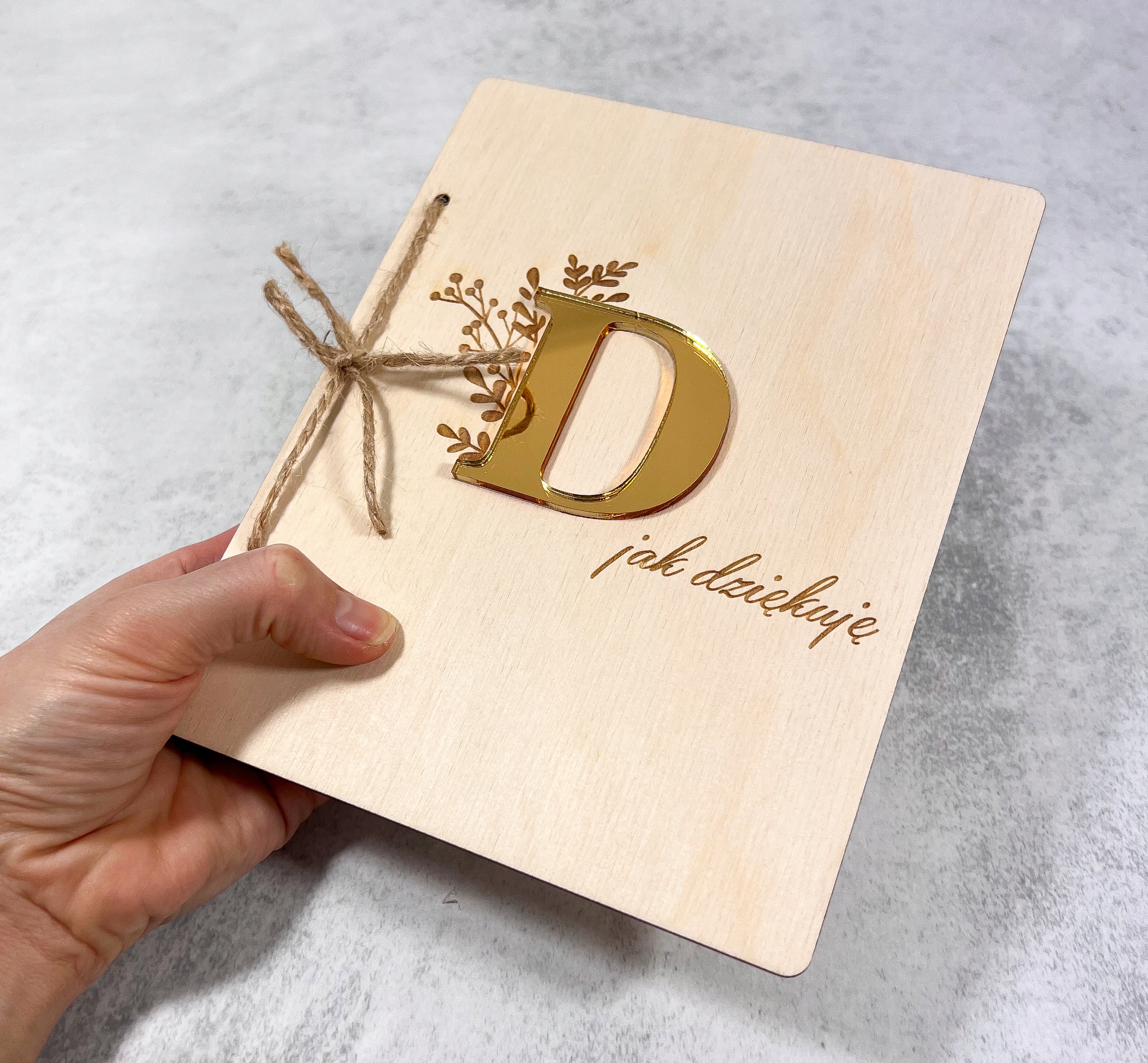 Открытка перевязана джутовой веревкой. Лицевая сторона карты украшена золотой буквой.