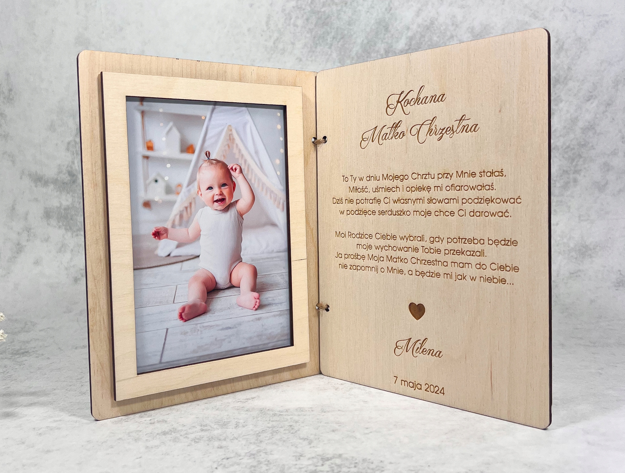 Красивый сувенир ко Святому Крещению. Деревянная открытка с фоторамкой и благодарственным письмом крестным.