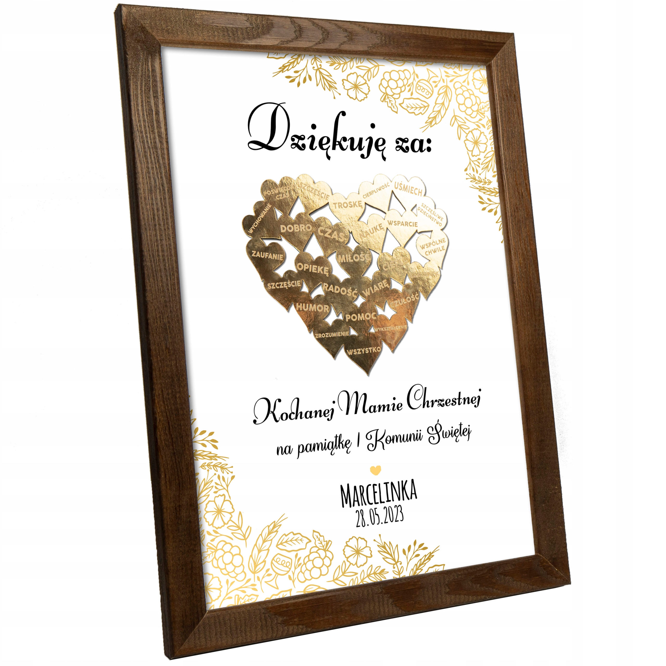 Центр рамки заполнен GOLDEN MIRROR HEART 3D, состоящим из сердечек меньшего размера, на которых выгравированы слова благодарности.