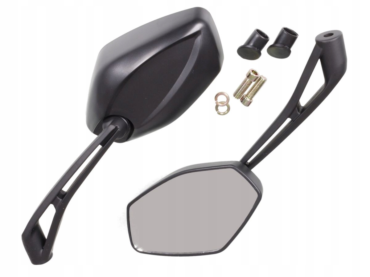 Современные черные матовые зеркала , установленные на прочном алюминиевом держателе. Их можно регулировать в одной плоскости. Размеры обеспечивают широкое поле зрения, что обеспечивает большую безопасность. В комплект входят крепежные винты диаметром 8 мм и соответствующие колпачки.