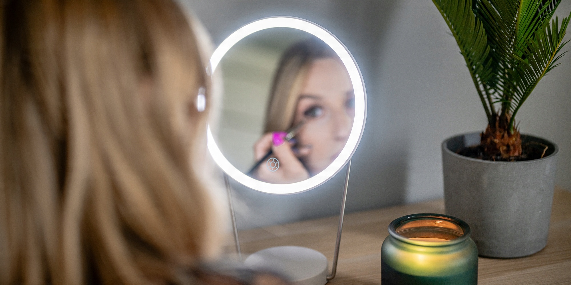 В зависимости от времени суток и существующих условий освещения вы можете самостоятельно регулировать мощность светодиодов, закрытых под молочным рассеивателем. Просто используйте сенсорную кнопку, встроенную в поверхность зеркала. Высокая интенсивность света хорошо работает в солнечный день, а более низкая интенсивность света — идеальное решение для макияжа, сделанного после наступления темноты или в темной комнате. Хорошо сбалансированный свет не режет глаза, что обязательно облегчит вам работу над макияжем.