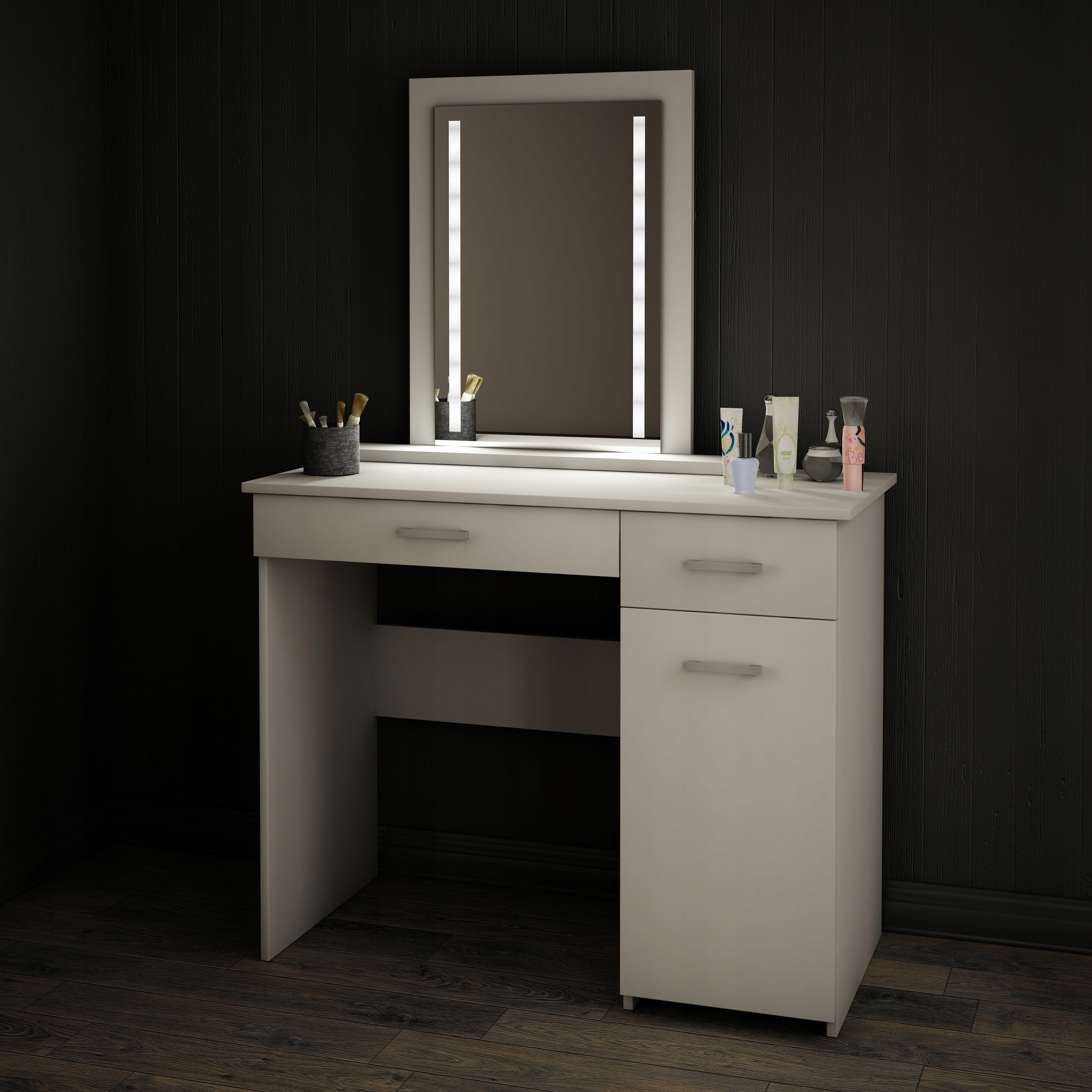Отдельно стоящее зеркало, еслитуалетный столик стоит прямо у стены. Если туалетный столик отодвинут от стены, прикрутите зеркало к нижней части столешницы. Зеркало можно разместить где угодно