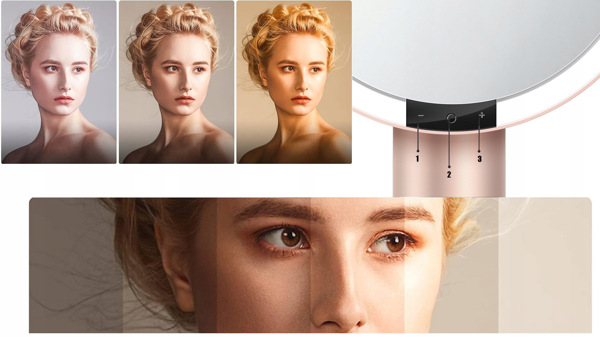 Кнопка «O» используется для включения устройства и выбора цвета света: естественного, холодного и теплого, чтобы вы могли увидеть, как будет выглядеть ваш макияж в различных условиях освещения. Кнопки «+/-» используются для увеличения или уменьшения уровня яркости.