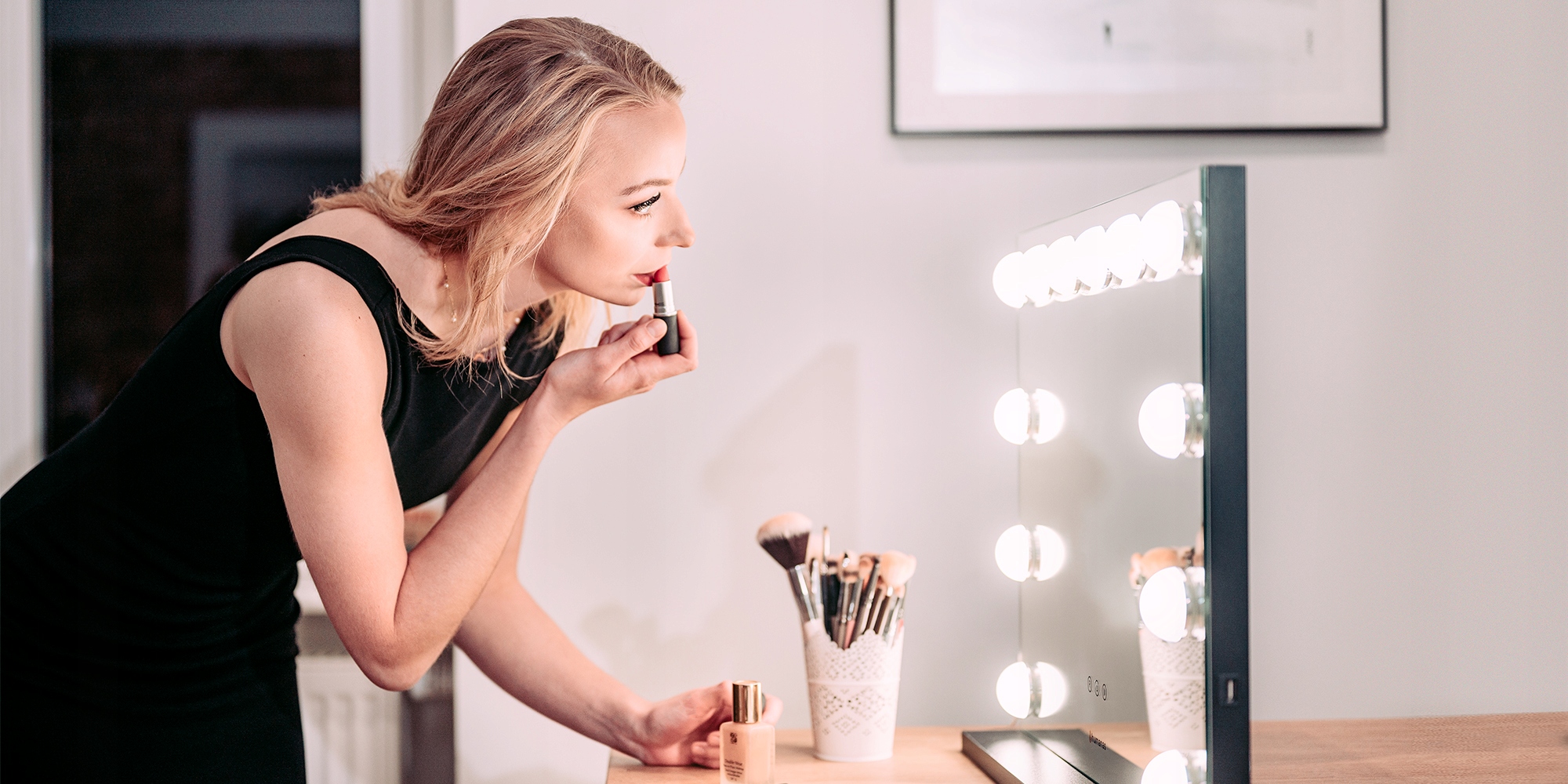 В зависимости от времени суток и существующих условий освещения вы можете самостоятельно регулировать мощность светодиодов, заключенных в молочные рассеиватели. Просто используйте сенсорную кнопку, незаметно встроенную в поверхность зеркала. Высокая интенсивность света хорошо работает в солнечный день, а более низкая интенсивность света является идеальным решением для макияжа, сделанного после наступления темноты или в темной комнате. Идеально сбалансированный свет не режет глаза, что значительно облегчает работу над макияжем или макияжем.