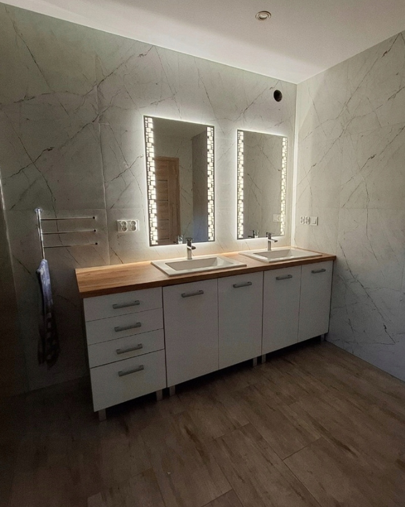 4️⃣ Электропитание: Зеркало подготовлено к подключению к электроустановке в стене. Кабели заканчиваются разъемами WAGO, что значительно упрощает установку. Для облегчения подключения можно изменить место установки блока питания. Затем мы запросим эту информацию в «примечаниях к покупке».