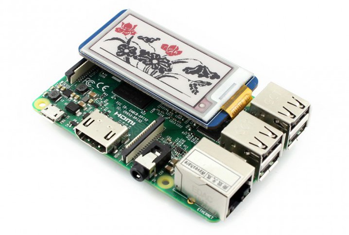 Оверлей для Raspberry Pi версий 3, 2 и Zero с дисплеем электронной бумаги 2,13 дюйма и разрешением 250 x 122 пикселей. Подключается напрямую к контактам GPIO.Связь с дисплеем происходит через интерфейс SPI. Производитель предоставляет примеры ПО для STM32, ARDUINO и Raspberry Pi.