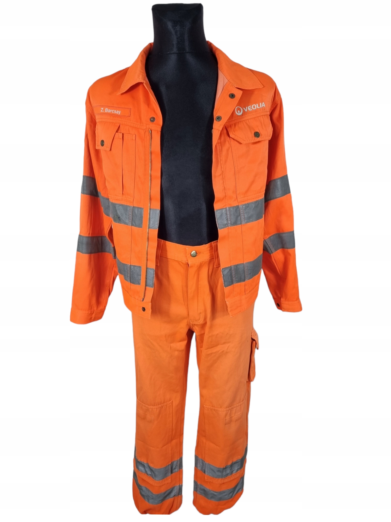Комплект выполнен из оранжевого материала с сертифицированными светоотражающими полосами. Одежда использовалась и находится в ОЧЕНЬ ХОРОШЕМ состоянии. Он имеет незначительные следы использования, например, разные нашивки с именами, разные логотипы. Имеет множество карманов, застегивающихся на кнопки или молнии. Произведен с немецких фабрик.