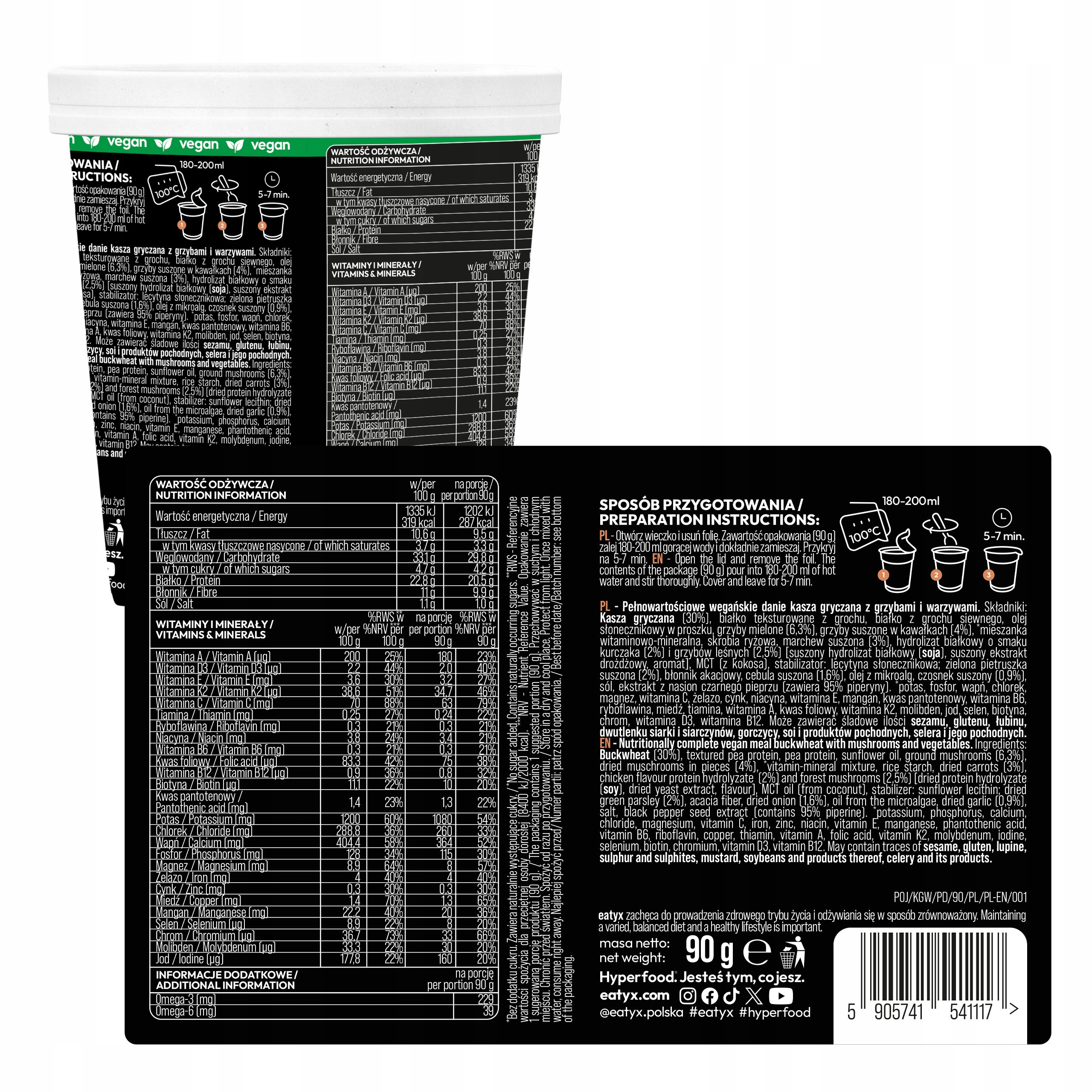 ➡️ EATYX Полноценный обед Крупа с грибами и овощами в новом, удобном формате стаканчиков! Идеально подходит для тех, кто ценит здоровое, растительное и быстрое питание без компромиссов. Благодаря этому инновационному решению вы сможете наслаждаться питательным блюдом, где бы вы ни находились – просто налейте в чашку кипяток и подождите несколько минут. Он помогает вам заботиться о своей фигуре, контролировать свой вес и количество потребляемых калорий. Продукт состоит из тщательно отобранных ингредиентов, обогащенных 26 витаминами и минералами, жирными кислотами омега-3-6, кокосовым маслом MTC, клетчаткой и белком. Идеальные пропорции ингредиентов и оптимальная калорийность делают eatyx идеальным выбором для здорового питания.