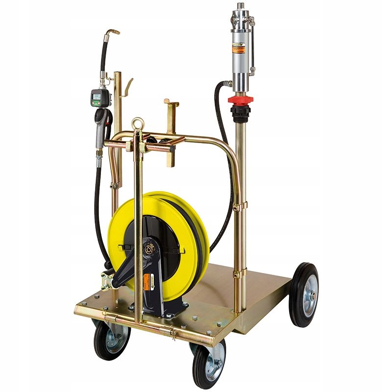 Комплект на колесах для раздачи масла рассчитан на бочку массой 180 ÷ 220 кг, с пневматическим поршневым насосом R 5:1 производительностью 18 л/мин, пневматической катушкой для шланга арт. 430/41 (длина 10м 1/2") и пистолетом раздаточным с цифровым счетчиком литров.