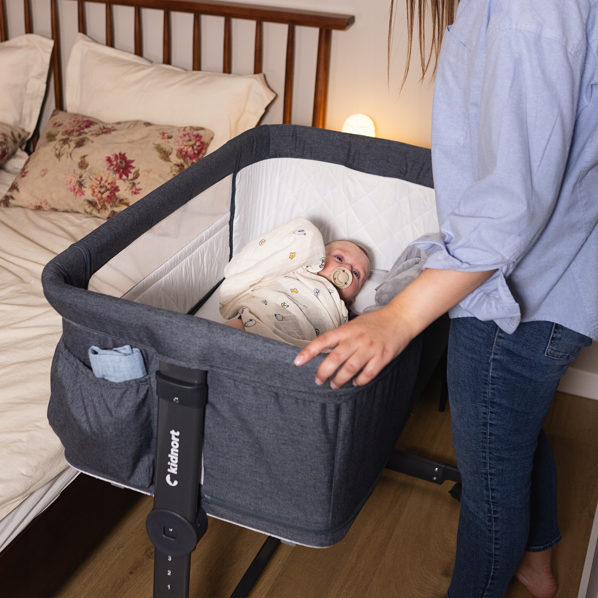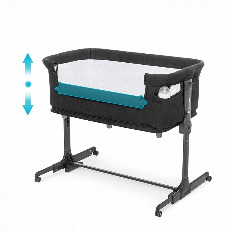 Пневматические ножки позволяют приблизить кроватку к кровати родителей, обеспечивая безопасное соединение. Кроме того, 4 колеса с фиксатором облегчают перемещение кровати и устойчиво фиксируют ее в выбранном месте, что повышает комфорт и функциональность.