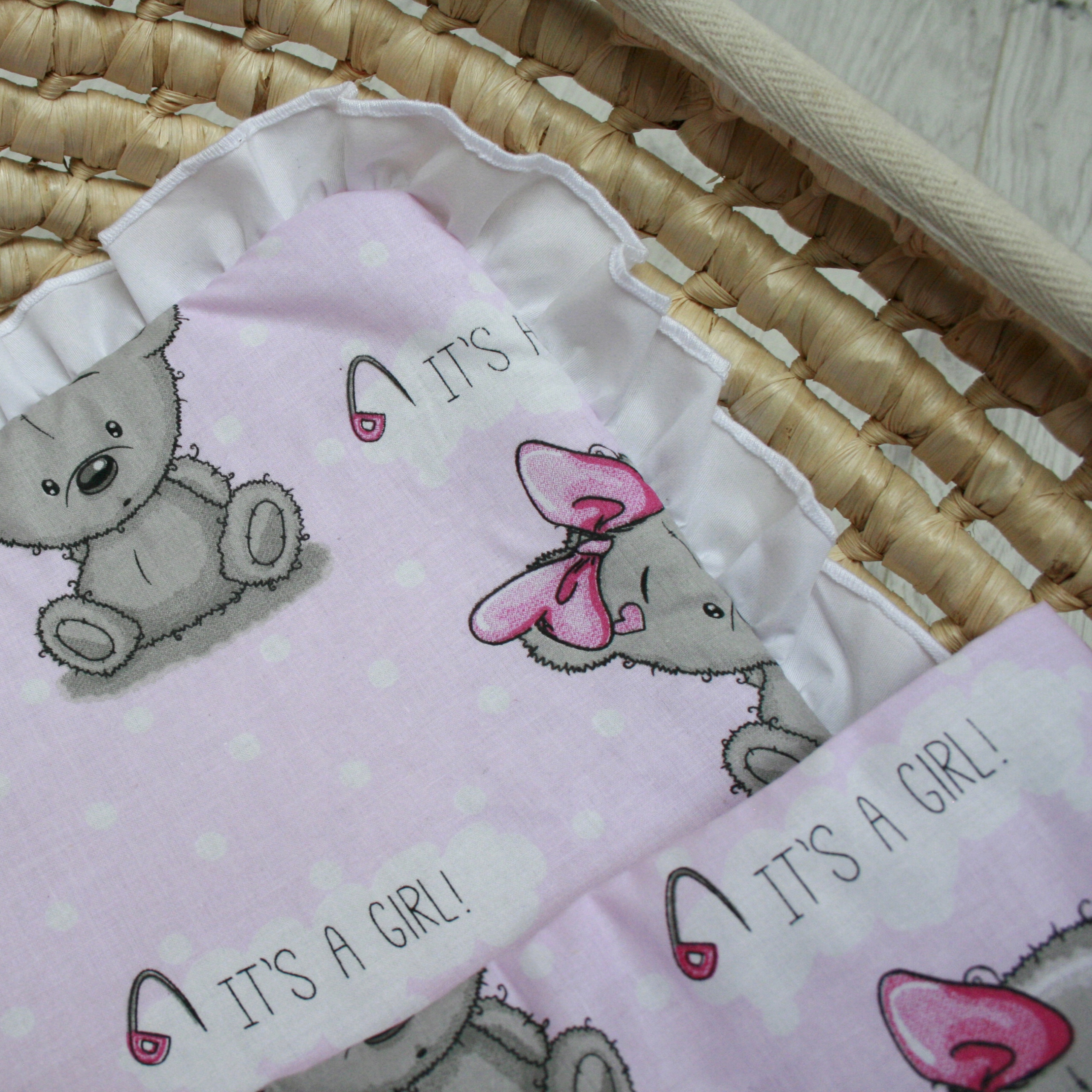 Комплект постельного белья с наполнителем из 100% хлопчатобумажной ткани. На подушке красивый декоративный рюш. Благодаря легкому наполнителю одеяла (вес 100 - 1 см) оно еще и теплое, и малышу будет хорошо и безопасно.