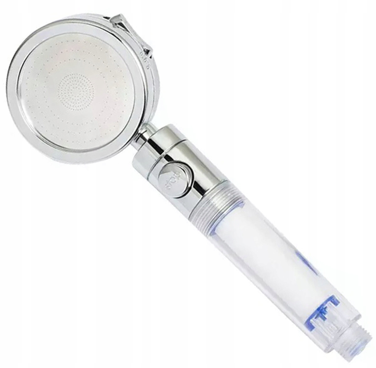 Хромированная душевая лейка. Предназначен для установки в стандартный душевой шланг. В трубке есть классическая функция душа и функция СТОП, останавливающая струю. Встроенный вентилятор (турбина) увеличивает мощность душа без увеличения расхода воды.
