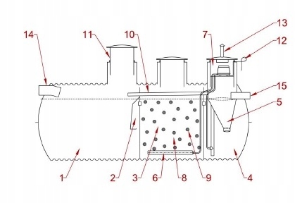 В первичном отстойнике происходят явления седиментации и флотации. Первоначально очищенные сточные воды поступают в камеру биологического реактора, где происходит полностью контролируемый процесс оксигенации сточных вод, что в сочетании с Фитинги из полиэтилена позволяют размножаться аэробным бактериям. Они создают активную суспензию в реакторе, участвующую в процессе очистки. Далее он стекает в вторичный отстойник - мертвый ил оседает на его дне и благодаря системе рециркуляции транспортируется в первичный отстойник. >. Благодаря работе данной системы необходимость ежегодной очистки от ила возникает только в первой камере очистного сооружения. В результате сточные воды очищаются почти на 98%. Вода настолько чиста, что ее можно сбрасывать в землю или напрямую в грунт. водозаборы водоемынапример, канавы, реки, ручьи и т. д.