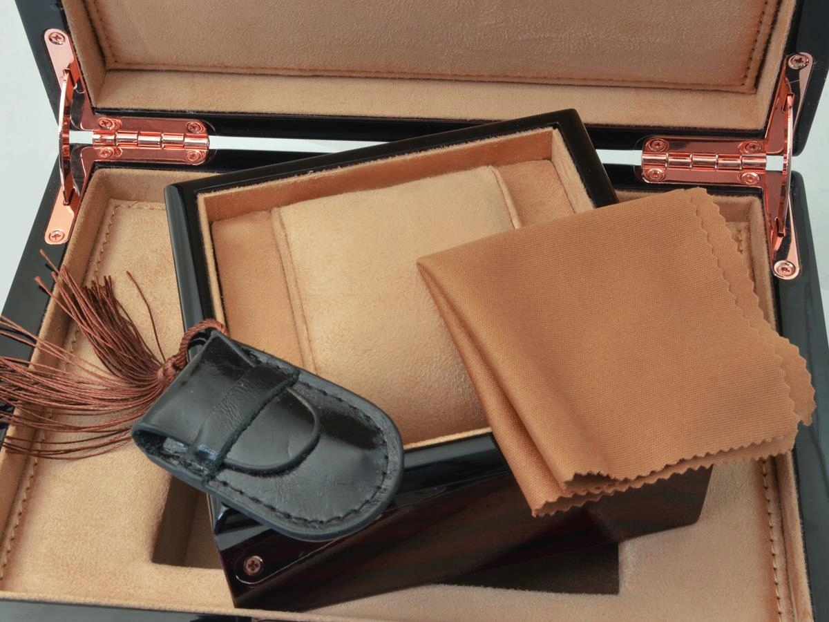 Очень роскошная, изысканная шкатулка, предназначенная для хранения ювелирных украшений или часов. Часы или украшения кладут на специальную бархатную подушку. Коробка очень тщательно отделана и, несомненно, является очень привлекательным дополнением к ценным часам.