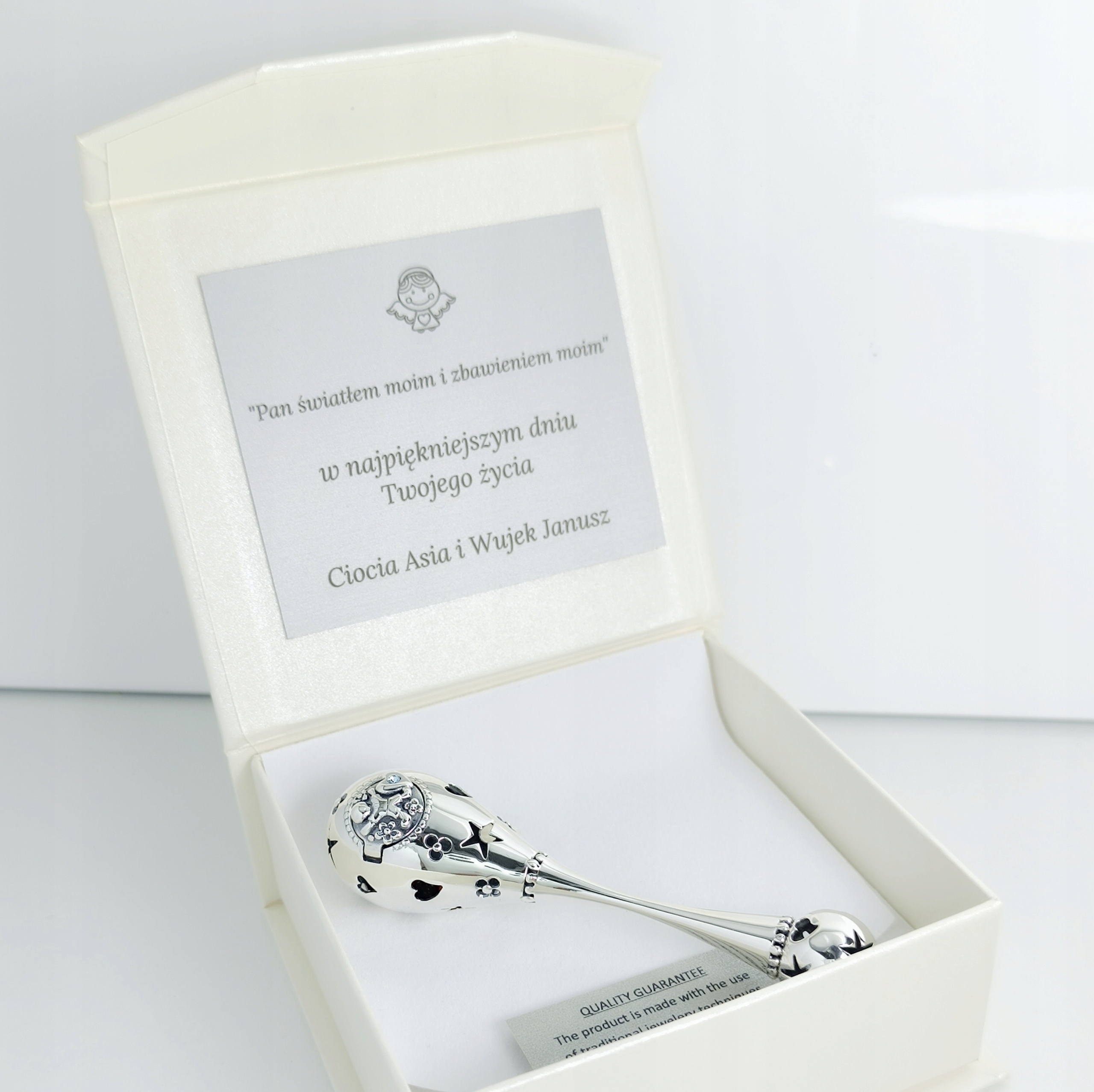 Погремушку также будет сопровождать табличка с ангелочком, на которой мы можем выгравировать любое посвящение или пожелания - по вашему желанию. предложения. (до ~ 200 символов)