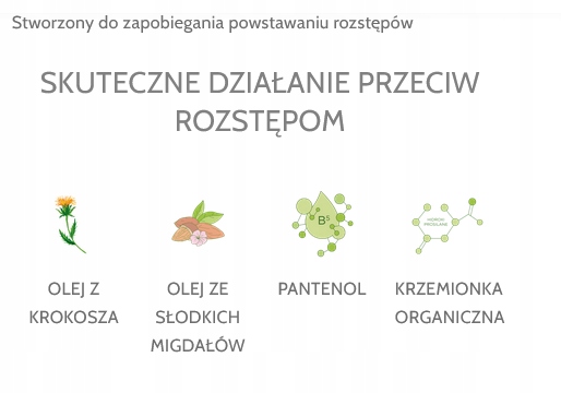 Продукт эффективно смазывает и стимулирует кожу, что снижает возможность повреждения коллагеновых волокон, ответственных за продольные изменения.
