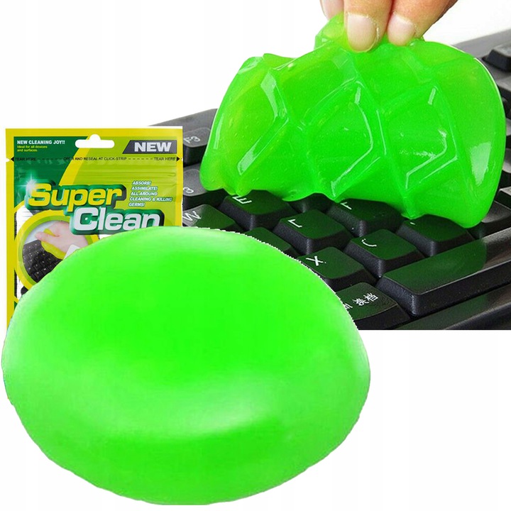 - Просто прижмите гель к грязному месту, Super Clean отрегулирует его прилегает ее форму к поверхности и собирает всю грязь.