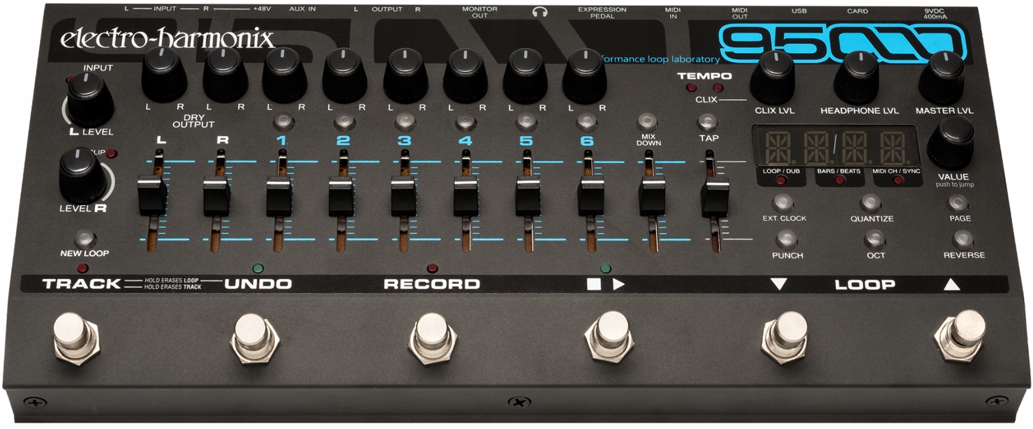 Electro Harmonix представляет наиболее продвинутую Looper до сих пор. Он содержит шесть моно -путей и один стерео -путь для смешивания. Записывает 375 минут и 100 петлей с 16 ГБ карты SD, а переключение между петлями быстро и легко