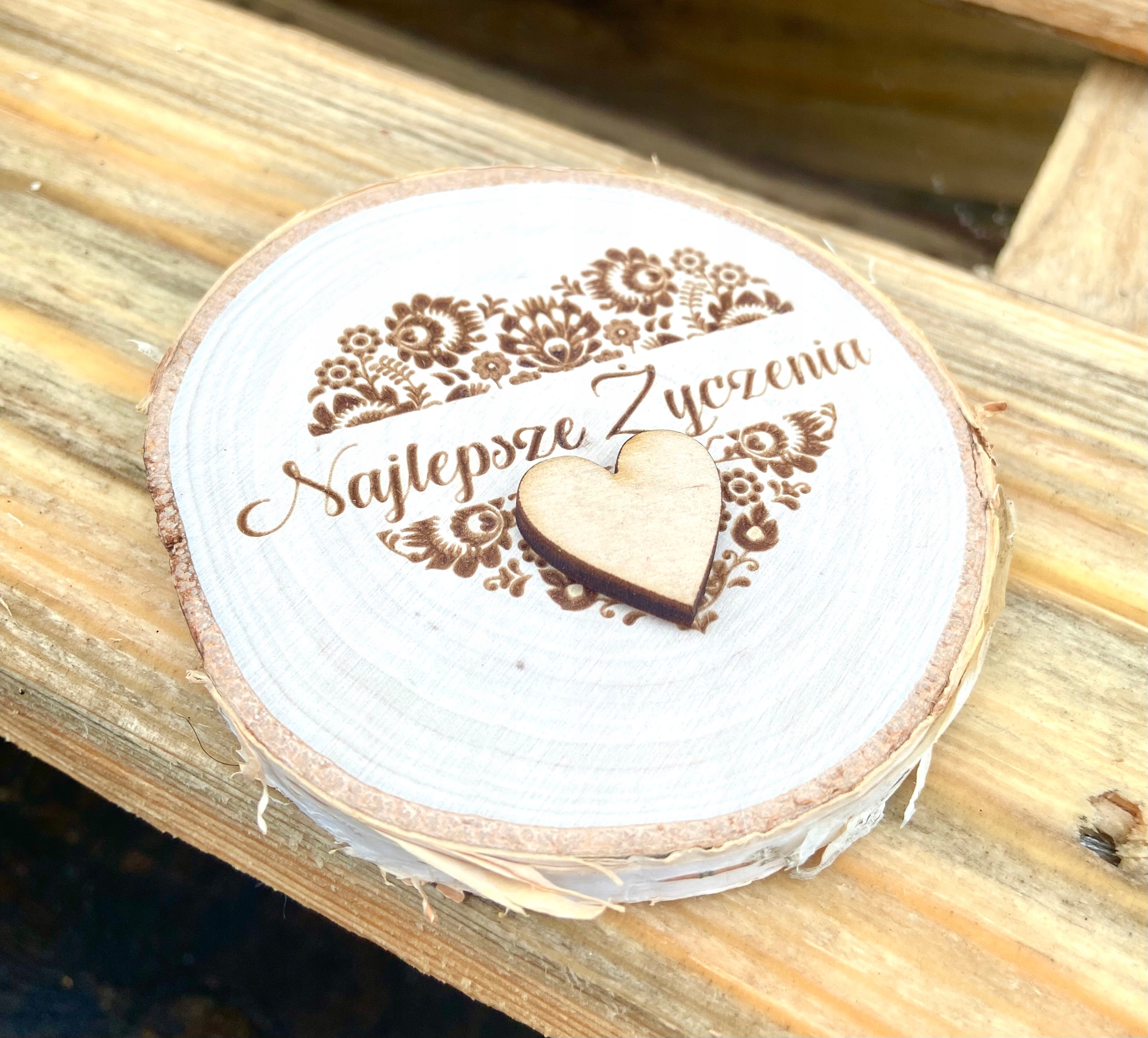 - кусок дерева с гравировкой сердца и надписью С наилучшими пожеланиями,