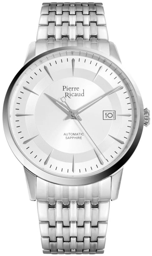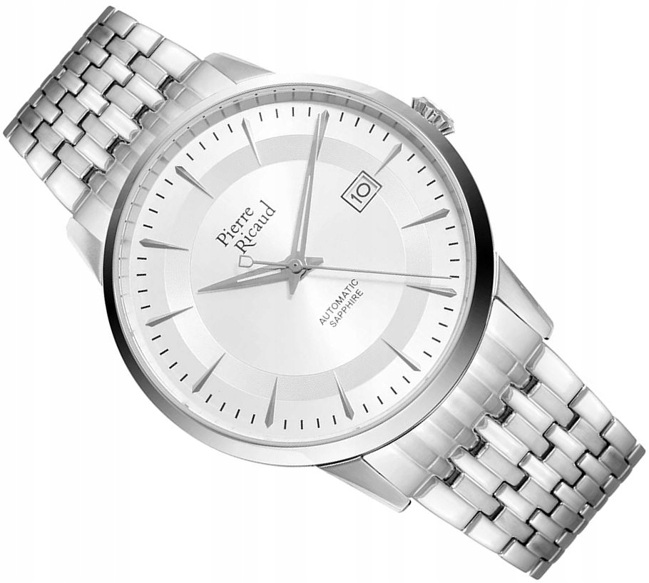 PIERRE RICAUD P60029.5113A — автоматическая модель с механизмом NH35. На 24 камнях, запас хода 40 часов. Он получает энергию от движения руки благодаря автоматическому заводу, поэтому не требует батареек. Корпус и браслет полностью изготовлены из высококачественной нержавеющей стали, которая гипоаллергенна, долговечна и устойчива к внешним факторам, таким как вода и пот. Серебряный циферблат покрыт сапфировым стеклом, которое обеспечивает оптическую прозрачность (лучшее среди часовых стекол), очень трудно царапается, устойчиво к перепадам температур и растворителям. В положении «3 часа» имеется практичный указатель даты, указывающий текущий день месяца. Водонепроницаемость 5 атм (50 м), устойчив к брызгам и кратковременному погружению в воду.