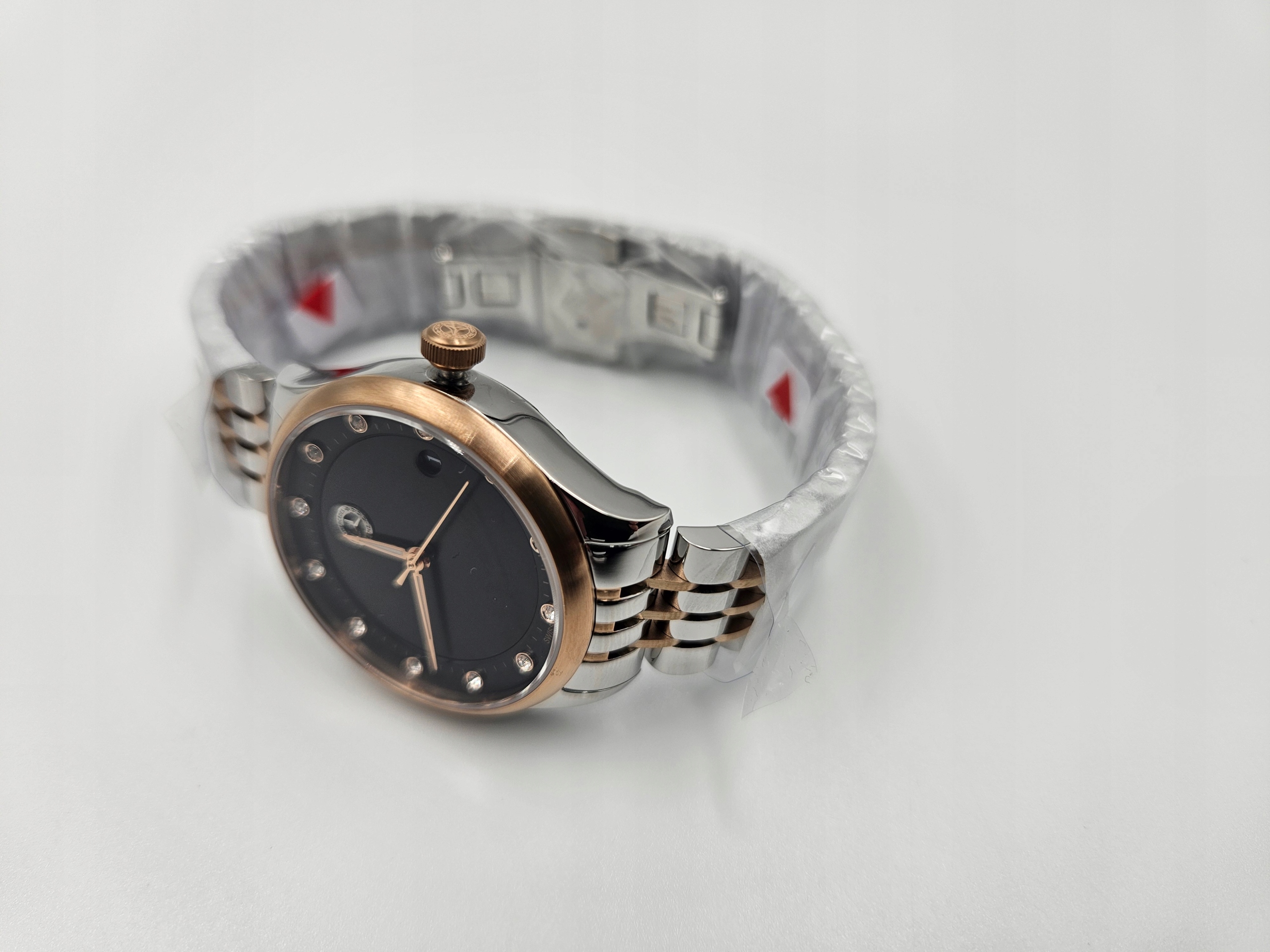 Корпус из полированной нержавеющей стали с матовой золотой рамкой привлекает внимание, а черный циферблат, защищенный сапфировым стеклом с антибликовым покрытием, восхищает встроенными кристаллами. Двухцветный ремешок из нержавеющей стали серебра и золота с элегантной застежкой-бабочкой идеально дополняет образ.