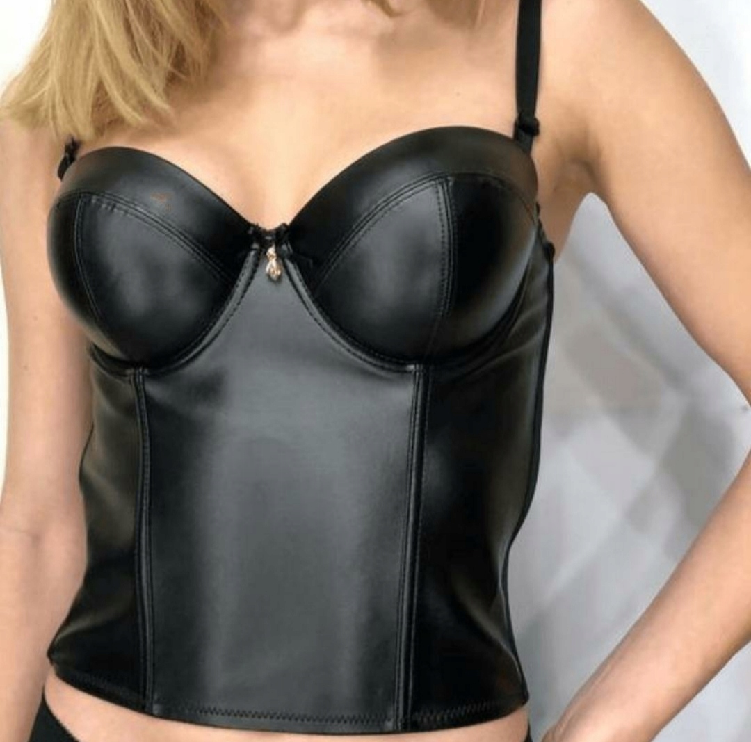 Элегантный корсет из искусственной кожи с формованными чашечками из пенопласта и косточками, обеспечивающими идеальную поддержку и форму зоны декольте. Встроенная вставка из пеноматериала обеспечивает дополнительный комфорт и приподнимает грудь. Спинка выполнена из гибкой сетки, обеспечивающей идеальную посадку и удобство ношения. Он усилен вертикальными косточками. Бретели съемные и регулируемые. Спинка застегивается на 13 крючков и имеет четыре удлинителя.