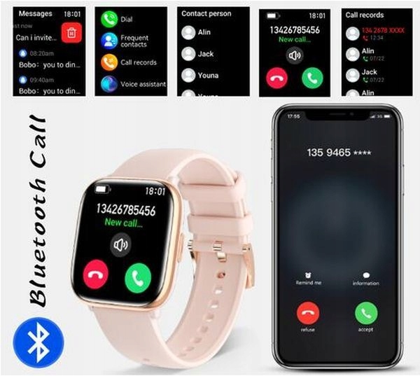 Умные часы, заключенные в прямоугольную конверт с кнопкой с кнопкой с кнопкой, подвешенной на розовом силиконовом баре.