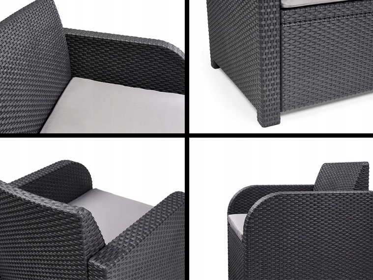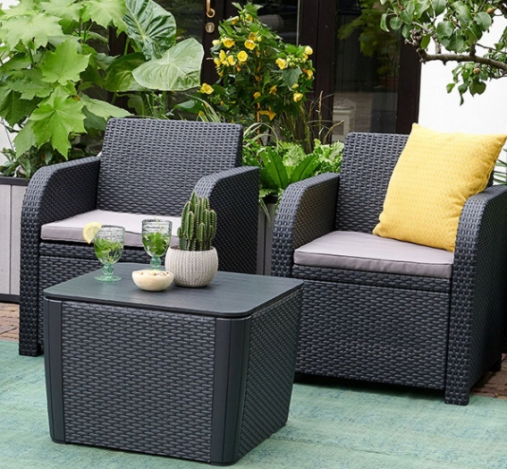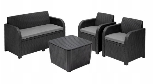 Мебельный комплект с фактурой, напоминающей натуральное ротанговое переплетение, включающий два кресла, двухместный диван и стол с дополнительной функцией хранения. > Комплект мебели прекрасно впишется в любое пространство дома, став комфортным местом для отдыха на свежем воздухе. Мебель имеет мягкие подушки и в целом создает стильный гарнитур в модных тонах. Простота сборки и легкость поддержания чистоты – дополнительные преимущества этого комплекта. Мебель отличается устойчивостью к неблагоприятным погодным условиям и ультрафиолетовым лучам.